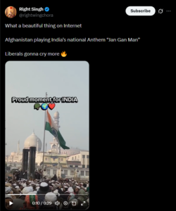 ಹಲವಾರು ಸಾಮಾಜಿಕ ಮಾಧ್ಯಮ ಬಳಕೆದಾರರು ಒಂದು ಕ್ಲಿಪ್ ಅನ್ನು ಹಂಚಿಕೊಂಡಿದ್ದು, ಅದರಲ್ಲಿ ಅಫ್ಘಾನಿಸ್ತಾನವು ಭಾರತದ ರಾಷ್ಟ್ರಗೀತೆಯನ್ನು ನುಡಿಸುತ್ತಿದೆ ಎಂದು ಹೇಳಿಕೊಂಡಿದ್ದಾರೆ. ದೃಢೀಕೃತ X ಬಳಕೆದಾರ ‘rightwingchora’ ಅಂತಹ ಕ್ಲಿಪ್ ಅನ್ನು: “ಅಂತರ್ಜಾಲದಲ್ಲಿ ಎಂತಹ ಸುಂದರ ವಿಷಯ. ಅಫ್ಘಾನಿಸ್ತಾನವು ಭಾರತದ ರಾಷ್ಟ್ರಗೀತೆ “ಜನ ಗನ ಮನ”ವನ್ನು ನುಡಿಸುತ್ತಿದೆ” ಉದಾರವಾದಿಗಳು ಇನ್ನಷ್ಟು ಅಳಲಿದ್ದಾರೆ”, ಎಂಬ ಶೀರ್ಷಿಕೆಯೊಂದಿಗೆ ಹಂಚಿಕೊಂಡಿದ್ದಾರೆ. 167,000ಕ್ಕೂ ಹೆಚ್ಚು ವೀಕ್ಷಣೆಗಳನ್ನು ಗಳಿಸಿದ ಈ ಪೋಸ್ಟ್ ಜೊತೆಗೆ ಭಾರತೀಯ ತ್ರಿವರ್ಣ ಧ್ವಜವನ್ನು ಹಾರಿಸುವಾಗ ಮಸೀದಿಯ ಮುಂದೆ ಭಾರತದ ರಾಷ್ಟ್ರಗೀತೆ ನುಡಿಸುತ್ತಿರುವುದನ್ನು ಗೌರವಯುತವಾಗಿ ನಿಂತಿದ್ದ ದೊಡ್ಡ ಜನಸಮೂಹವು ನೋಡುತ್ತಿರುವ 29 ಕ್ಷಣಗಳ ಕ್ಲಿಪ್ ಅನ್ನು ಲಗತ್ತಿಸಲಾಗಿದೆ. ಪೋಸ್ಟ್ ಅನ್ನು ಕೆಳಗೆ ನೋಡಿ-