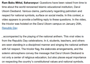 ಇದರ ನಂತರ, ಹೆಚ್ಚಿನ ವಿವರಗಳಿಗಾಗಿ ನಾವು ” ದಾರು ಉಲೂಮ್ ದಿಯೋಬಂದ್ ನಲ್ಲಿ ಭಾರತೀಯ ರಾಷ್ಟ್ರಗೀತೆ ಮತ್ತು ತ್ರಿವರ್ಣ ಧ್ವಜ ಹಾರಿಸಲಾಯಿತು, ಗಣರಾಜ್ಯೋತ್ಸವ 2026″ ಎಂಬ ಪದಗಳೊಂದಿಗೆ ಅಂತರ್ಜಾಲ ಹುಡುಕಾಟವನ್ನು ನಡೆಸಿದೆವು. ನವಭಾರತ್ ಟೈಮ್ಸ್ ವರದಿಯ ಪ್ರಕಾರ (ಮೂಲತಃ ಹಿಂದಿಯಲ್ಲಿ, ಕನ್ನಡಕ್ಕೆ ಅನುವಾದಿಸಲಾಗಿದೆ), “ಜನವರಿ 26ರಂದು ಗಣರಾಜ್ಯೋತ್ಸವದ ಸಂದರ್ಭದಲ್ಲಿ ದಾರುಲ್ ಉಲೂಮ್ ಕ್ಯಾಂಪಸ್‌ನಲ್ಲಿ ತ್ರಿವರ್ಣ ಧ್ವಜವನ್ನು ಹಾರಿಸಲಾಯಿತು, ಜೊತೆಗೆ ರಾಷ್ಟ್ರಗೀತೆಯನ್ನೂ ನುಡಿಸಲಾಯಿತು.” ” ದಾರುಲ್ ಉಲೂಮ್ ದಿಯೋಬಂದ್ ಈ ದೇಶದ ಮಣ್ಣಿನಲ್ಲಿ ಆಳವಾಗಿ ಬೇರೂರಿದೆ ಎಂದು ಜನವರಿ 26ರ ವೀಡಿಯೊ ಮತ್ತೊಮ್ಮೆ ಸಾಬೀತುಪಡಿಸಿದೆ” ಎಂದೂ ಸಹ ವರದಿಯಲ್ಲಿ ಉಲ್ಲೇಖಿಸಲಾಗಿದೆ. ವರದಿಯ ಒಂದು ಭಾಗವನ್ನು ಕೆಳಗೆ ನೋಡಿ-