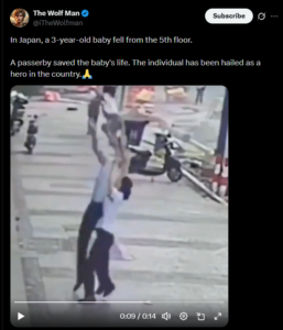 ಇತ್ತೀಚೆಗೆ ಹಲವಾರು ಸಾಮಾಜಿಕ ಮಾಧ್ಯಮ ಬಳಕೆದಾರರು 5ನೇ ಮಹಡಿಯಿಂದ ಬೀಳುತ್ತಿದ್ದ ಮಗುವನ್ನು ರಕ್ಷಿಸಿರುವ ವೀಡಿಯೊವನ್ನು ಹಂಚಿಕೊಂಡಿದ್ದಾರೆ. ದೃಢೀಕೃತ X ಬಳಕೆದಾರ ‘TheWolfman’ ಅಂತಹ ಒಂದು ಪೋಸ್ಟ್ ಅನ್ನು ಈ ಕೆಳಗಿನ ಹೇಳಿಕೆಯೊಂದಿಗೆ ಹಂಚಿಕೊಂಡಿದ್ದಾರೆ: “ಜಪಾನ್ನಲ್ಲಿ, 3 ವರ್ಷದ ಮಗು 5ನೇ ಮಹಡಿಯಿಂದ ಬಿದ್ದಿತು. ದಾರಿಹೋಕರೊಬ್ಬರು ಮಗುವಿನ ಜೀವವನ್ನು ಉಳಿಸಿದರು. ಆ ವ್ಯಕ್ತಿಯನ್ನು ದೇಶದಲ್ಲಿ ಹೀರೋ ಎಂದು ಪ್ರಶಂಸಿಸಲಾಗಿದೆ.” ಇದರೊಂದಿಗೆ ಸನ್ನಿವೇಶದ 14 ಸೆಕೆಂಡುಗಳ ವೀಡಿಯೊವನ್ನು ಸೇರಿಸಲಾಗಿದೆ, ಇದಕ್ಕೆ 2.6 ಮಿಲಿಯಕ್ಕಿಂತಲೂ ಹೆಚ್ಚು ವೀಕ್ಷಣೆಗಳು ದೊರಕಿವೆ. ಕೆಳಗಿನ ಪೋಸ್ಟ್ ಅನ್ನು ನೋಡಿ-