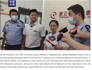 ಆದಾಗ್ಯೂ, ಕನ್ನಡಕ್ಕೆ ಅನುವಾದಿಸಲಾದ ಪೀಪಲ್ಆಪ್ನ ಮತ್ತೊಂದು ವರದಿಯಲ್ಲಿ ಉಲ್ಲೇಖಿಸಿರುವುದೇನೆಂದರೆ, ಹುಡುಗಿ 6ನೇ ಮಹಡಿಯಿಂದ (ಅಥವಾ ಐದನೇ ಮಹಡಿಯ ಫ್ಲಾಟ್ನಿಂದ) ಬಿದ್ದಳು ಮತ್ತು ಈ “ದೃಶ್ಯವು ಝೆಜಿಯಾಂಗ್ ಪ್ರಾಂತ್ಯದ ಜಿಯಾಕ್ಸಿಂಗ್ನ ಟಾಂಗ್ಸಿಯಾಂಗ್ ನಗರದಲ್ಲಿ ನಡೆಯಿತು”. “ಝೆಜಿಯಾಂಗ್ ಪ್ರಾಂತ್ಯದ ಟಾಂಗ್ಸಿಯಾಂಗ್ ನಗರ ಸಾರ್ವಜನಿಕ ಭದ್ರತಾ ಬ್ಯೂರೋದ ಪ್ರಶಂಸಾ ತಂಡವು ಈ ಇಬ್ಬರು ವ್ಯಕ್ತಿಗಳ ಶೂರತೆಯನ್ನು ದೃಢಪಡಿಸಿತು ಮತ್ತು ಅವರಿಗೆ ಮನ್ನಣೆಯ ಪ್ರಮಾಣಪತ್ರಗಳನ್ನು ನೀಡಿತು” ಎಂದು ವರದಿ ಬರೆಯುತ್ತದೆ. ಇದರ ಒಂದು ಭಾಗವನ್ನು ಕೆಳಗೆ ನೋಡಿ-