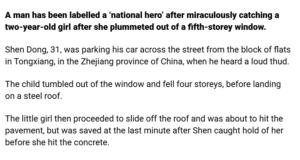 ಇದರ ನಂತರ ಈ ವಿಷಯವನ್ನು ಇನ್ನಷ್ಟು ಪರಿಶೀಲಿಸಲು, “2 ವರ್ಷದ ಮಗು ಚೀನಾದ 5ನೇ ಮಹಡಿಯಿಂದ ಬೀಳುತ್ತಿದ್ದಾಗ ರಕ್ಷಿಸಲ್ಪಟ್ಟಳು” ಎಂಬ ಪದಗಳೊಂದಿಗೆ ನಾವು ಅಂತರ್ಜಾಲದ ಹುಡುಕಾಟವನ್ನು ನಡೆಸಿದೆವು. ಮೆಟ್ರೊUK ವರದಿಯ ಪ್ರಕಾರ, ಹುಡುಗಿ “ಐದನೇ ಮಹಡಿಯ ಕಿಟಕಿಯಿಂದ ಕೆಳಗೆ ಬಿದ್ದಳು”, ಮೊದಲ ಮಹಡಿಯ ಟೆರೇಸ್ ಮೇಲೆ ಬಿದ್ದಳು, ಮತ್ತು “31 ವರ್ಷದ ಶೆನ್ ಡಾಂಗ್ ರಸ್ತೆಯಾಚೆ ತಮ್ಮ ಕಾರನ್ನು ನಿಲ್ಲಿಸುತ್ತಿದ್ದಾಗ ಜೋರಾದ ಶಬ್ದ ಕೇಳಿ, ಇದನ್ನು ಗಮನಿಸಿ ಮಗು ಕಾಂಕ್ರೀಟ್ಗೆ ಅಪ್ಪಳಿಸುವ ಮೊದಲು ಆಕೆಯನ್ನು ಹಿಡಿದರು.” ವರದಿಯ ಒಂದು ಭಾಗವನ್ನು ಕೆಳಗೆ ನೋಡಿ-
