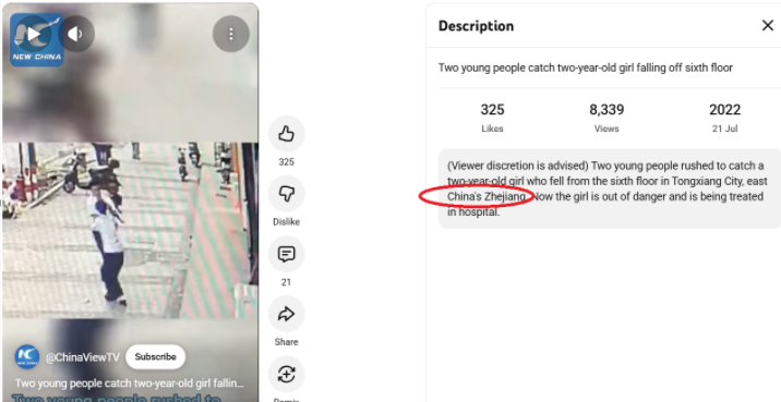 ಸನ್ನಿವೇಶದ ಬಗ್ಗೆ ಇನ್ನಷ್ಟು ತಿಳಿದುಕೊಳ್ಳಲು ನಾವು ಮೊದಲು ವೀಡಿಯೊದ ವಿವಿಧ ಕೀಫ್ರೇಮ್ಗಳನ್ನು ತೆಗೆದು ರಿವರ್ಸ್ ಇಮೇಜ್ ಹುಡುಕಾಟವನ್ನು ನಡೆಸಿದೆವು. ಹುಡುಕಾಟದ ಫಲಿತಾಂಶಗಳಲ್ಲಿ ನಮಗೆ ಚೈನಾವ್ಯೂಟಿವಿ ಅಪ್ಲೋಡ್ ಮಾಡಿದ ಯುಟ್ಯೂಬ್ ಕಿರುಚಿತ್ರವು ದೊರಕಿತು, ಅದರ ಶೀರ್ಷಿಕೆ ಹೀಗಿದೆ: “ಆರನೇ ಮಹಡಿಯಿಂದ ಬೀಳುತ್ತಿದ್ದ ಎರಡು ವರ್ಷದ ಬಾಲಕಿಯನ್ನು ಇಬ್ಬರು ಯುವಕರು ಹಿಡಿದರು” ವಿವರಣೆಯಲ್ಲಿ “ಪೂರ್ವ ಚೀನಾದ ಝೆಜಿಯಾಂಗ್ನ ಟಾಂಗ್ಸಿಯಾಂಗ್ ನಗರದಲ್ಲಿ ಆರನೇ ಮಹಡಿಯಿಂದ ಬಿದ್ದ ಎರಡು ವರ್ಷದ ಬಾಲಕಿಯನ್ನು ಹಿಡಿಯಲು ಇಬ್ಬರು ಯುವಕರು ಧಾವಿಸಿದರು” ಎಂದು ಉಲ್ಲೇಖಿಸಲಾಗಿದೆ. ಇದರ ವೀಡಿಯೊ ಮತ್ತು ಸ್ಕ್ರೀನ್ಶಾಟ್ ಅನ್ನು ಕೆಳಗೆ ನೋಡಿ-