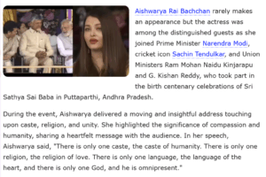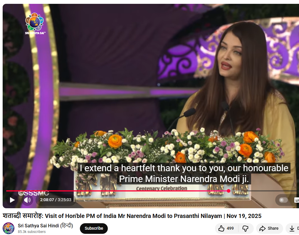 ತಮ್ಮ ಭಾಷಣದ ಸಮಯದಲ್ಲಿ, ಐಶ್ವರ್ಯಾರವರು ಬಾಬಾರವರ ಕುರಿತಾದ ಭಕ್ತಿಯನ್ನು ವ್ಯಕ್ತಪಡಿಸುತ್ತಾರೆ ಮತ್ತು ಅವರ ಬೋಧನೆಗಳು ಅವರ ಜನ್ಮ ಶತಮಾನ ಕಳೆದರೂ ಲಕ್ಷಾಂತರ ಜನರಿಗೆ ಸ್ಫೂರ್ತಿ ನೀಡುತ್ತಲೇ ಇವೆ ಎಂದು ಹೇಳುತ್ತಾರೆ. ಆಕೆ ಪ್ರಧಾನಿ ಮೋದಿಯವರ ಉಪಸ್ಥಿತಿಗಾಗಿ ಧನ್ಯವಾದಗಳನ್ನು ಅರ್ಪಿಸುತ್ತಾ, ಅವರ ಉಪಸ್ಥಿತಿಯು ನೈರ್ಮಲ್ಯವನ್ನು ಇನ್ನಷ್ಟು ಹೆಚ್ಚಿಸುತ್ತದೆ ಮತ್ತು ನಿಜವಾದ ನಾಯಕತ್ವ ಎಂದರೆ ದೇವರ ಸೇವೆಯಂತೆ ಮಾನವೀಯತೆಗೆ ಸೇವೆ ಸಲ್ಲಿಸುವುದು ಎಂಬ ಬಾಬಾರವರ ವಿಚಾರವನ್ನು ನೆನೆಯುತ್ತಾರೆ. ಆಪರೇಷನ್ ಸಿಂಧೂರ್ ಕುರಿತಾದ ಪ್ರಶ್ನೆಯಿರಲಿ ಆಕೆ ಪ್ರಧಾನಿ ಮೋದಿಯವರನ್ನು ಯಾವುದರ ಬಗ್ಗೆಯೂ ಪ್ರಶ್ನಿಸುವುದಿಲ್ಲ. ಕೆಳಗೆ ಪೂರ್ಣ ವೀಡಿಯೊ ಮತ್ತು ಸ್ಕ್ರೀನ್ಶಾಟ್ ನೋಡಿ.