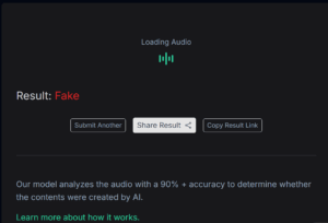 ಕೊನೆಯದಾಗಿ, ನಾವು ಕ್ಲೈಮ್ನಲ್ಲಿ ಹಂಚಿಕೊಂಡ ವೀಡಿಯೊದಿಂದ ಆಡಿಯೊವನ್ನು ಹೊರತೆಗೆದು Resemble AI ನ ಆಡಿಯೊ ಡಿಟೆಕ್ಷನ್ ಟೂಲ್ ನಲ್ಲಿ ಅದನ್ನು ಹಾಕಿದೆವು. ಫಲಿತಾಂಶಗಳು ನಕಲಿಯೆಂದು ತಿಳಿಸಿದವು, ಮತ್ತು ಈ ಮೂಲಕ ಅದು AI ರಚಿತ ಎಂದು ಸಾಬೀತಾಯಿತು. ಫಲಿತಾಂಶಗಳನ್ನು ಕೆಳಗೆ ನೋಡಿ-