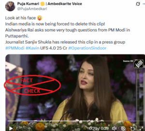 ಹಲವಾರು ಸಾಮಾಜಿಕ ಮಾಧ್ಯಮ ಬಳಕೆದಾರರು ಅಶ್ವರ್ಯ ರೈ ಬಚ್ಚನ್ ಮತ್ತು ಭಾರತದ ಪ್ರಧಾನಿ ನರೇಂದ್ರ ಮೋದಿಯವರ ನಡುವಿನ ಚರ್ಚೆಯ ವೈರಲ್ ವೀಡಿಯೊ ಕ್ಲಿಪ್ ಅನ್ನು ಹಂಚಿಕೊಳ್ಳುತ್ತಿದ್ದಾರೆ. ಬಾಲಿವುಡ್ ನಟಿ ಐಶ್ವರ್ಯ ರೈ ಬಚ್ಚನ್ ರವರು “ಆಪರೇಷನ್ ಸಿಂಧೂರ್” ಸಮಯದಲ್ಲಿ ಭಾರತದ ಮಿಲಿಟರಿ ಹಿನ್ನಡೆಗಳು ಎನ್ನಲಾಗಿರುವ ಅಂಶಗಳ ಬಗ್ಗೆ ಪ್ರಧಾನಿ ಮೋದಿಯವರನ್ನು ನೇರವಾಗಿ ಪ್ರಶ್ನಿಸುತ್ತಿರುವುದನ್ನು ತೋರಿಸುವ 29 ಸೆಕೆಂಡುಗಳ ವೀಡಿಯೊ ಕ್ಲಿಪ್ ಅನ್ನು ಸಹ ಈ ಪೋಸ್ಟ್ ನಲ್ಲಿ ಹಂಚಿಕೊಳ್ಳಲಾಗಿದೆ. ಪೋಸ್ಟ್ ಅನ್ನು ಕೆಳಗೆ ನೋಡಿ: