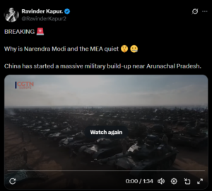 ಚೀನಾ ದೇಶವು ಅರುಣಾಚಲ ಪ್ರದೇಶದಲ್ಲಿ ತನ್ನ ಮಿಲಿಟರಿ ಉಪಸ್ಥಿತಿಯನ್ನು ಹೆಚ್ಚಿಸುತ್ತಿದೆ ಮತ್ತು ಭಾರತ ಅದನ್ನು ಎದುರಿಸಲು ಯಾವುದೇ ಕ್ರಮ ಕೈಗೊಂಡಿಲ್ಲ ಎಂದು ಹಲವಾರು ಸಾಮಾಜಿಕ ಮಾಧ್ಯಮ ಬಳಕೆದಾರರು ಹೇಳಿಕೊಂಡಿದ್ದಾರೆ. ದೃಢೀಕೃತ X ಬಳಕೆದಾರ ‘RavinderKapur2’ ಅಂತಹ ಒಂದು ಹೇಳಿಕೆಯನ್ನು ಹಂಚಿಕೊಳ್ಳುತ್ತಾ “ಬ್ರೇಕಿಂಗ್… ನರೇಂದ್ರ ಮೋದಿ ಮತ್ತು ವಿದೇಶಾಂಗ ಸಚಿವಾಲಯ ಏಕೆ ಮೌನವಾಗಿದ್ದಾರೆ… ಅರುಣಾಚಲ ಪ್ರದೇಶದ ಬಳಿ ಚೀನಾ ಬೃಹತ್ ಮಿಲಿಟರಿ ಜಮಾವಣೆಯನ್ನು ಅರಂಭಿಸಿದೆ” ಎಂದರು. ಮರುಭೂಮಿಯಂತಹ ಪ್ರದೇಶದಲ್ಲಿ ನೂರಾರು ಟ್ಯಾಂಕ್‌ಗಳು ಮತ್ತು ವಾಹನಗಳನ್ನು ಒಟ್ಟಾಗಿಸಿರುವುದನ್ನು ತೋರಿಸುವ CGTN ನ ವೀಡಿಯೊದೊಂದಿಗೆ ಇದನ್ನು ಪೋಸ್ಟ್ ಮಾಡಲಾಗಿದೆ.