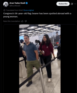 ರೋಧ ಪಕ್ಷದ ನಾಯಕ ರಾಹುಲ್ ಗಾಂಧಿಯವರು ವಿದೇಶಿ ಹುಡುಗಿಯೊಂದಿಗೆ ವಿದೇಶದಲ್ಲಿದ್ದಾರೆ ಎಂದು ಹೇಳಿಕೊಳ್ಳುವ ವೀಡಿಯೊವನ್ನು ಹಲವಾರು ಬಳಕೆದಾರರು ಹಂಚಿಕೊಂಡಿದ್ದಾರೆ. ದೃಢೀಕೃತ X ಬಳಕೆದಾರ ‘ArunKoslii’ ಇಂತಹ ಒಂದು ಪೋಸ್ಟ್ ಅನ್ನು ಈ ಮುಂದಿನ ಶೀರ್ಷಿಕೆಯೊಂದಿಗೆ ಹಂಚಿಕೊಂಡಿದ್ದಾರೆ: कांग्रेस के 56 साल के झंडनायक किसी 9 जवान महिला के साथ देखे गये है विदेश में. ಕನ್ನಡದಲ್ಲಿ ಇದು ಹೀಗಿದೆ: “ಕಾಂಗ್ರೆಸ್ನ 56 ವರ್ಷದ ದಂಡ-ನಾಯಕ ವಿದೇಶದಲ್ಲಿ ಯಾವುದೋ ನವಯುವತಿಯೊಂದಿಗೆ ಕಾಣಿಸಿಕೊಂಡಿದ್ದಾರೆ.” ಪೋಸ್ಟ್ ಸುಮಾರು 1.2 ಮಿಲಿಯ ವೀಕ್ಷಣೆಗಳನ್ನು ಗಳಿಸಿದೆ ಮತ್ತು ಅದನ್ನು ಇಲ್ಲಿ ವೀಕ್ಷಿಸಬಹುದು: