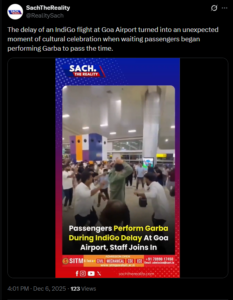 ಡಿಸೆಂಬರ್ 2025 ರಲ್ಲಿ ಇಂಡಿಗೋ ವಿಮಾನ ವಿಳಂಬದ ಸಮಯದಲ್ಲಿ ಜನರು ಗಾರ್ಬಾ ನೃತ್ಯ ಮಾಡುತ್ತಿರುವ ಬಗ್ಗೆ ಹಲವಾರು ಸಾಮಾಜಿಕ ಮಾಧ್ಯಮ ಬಳಕೆದಾರರು ವಿವಿಧ ಹೇಳಿಕೆಗಳನ್ನು ಹಂಚಿಕೊಂಡಿದ್ದಾರೆ. X ಬಳಕೆದಾರ ‘RealitySach’ ಡಿಸೆಂಬರ್ 6, 2025 ರಂದು ಈ ಮುಂದಿನ ಹೇಳಿಕೆಯೊಂದಿಗೆ ಅಂತಹ ಒಂದು ಹೇಳಿಕೆಯನ್ನು ಹಂಚಿಕೊಂಡಿದ್ದಾರೆ “ಕಾಯುತ್ತಿರುವ ಪ್ರಯಾಣಿಕರು ಸಮಯ ಕಳೆಯಲು ಗಾರ್ಬಾ ನೃತ್ಯ ಮಾಡಲು ಪ್ರಾರಂಭಿಸಿದಾಗ ಗೋವಾ ವಿಮಾನ ನಿಲ್ದಾಣದಲ್ಲಿ ಇಂಡಿಗೋ ವಿಮಾನದ ವಿಳಂಬವು ಅನಿರೀಕ್ಷಿತ ಸಾಂಸ್ಕೃತಿಕ ಆಚರಣೆಯಾಗಿ ಮಾರ್ಪಟ್ಟಿತು”.