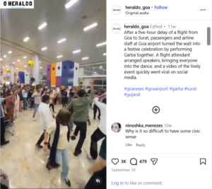 ಅದರ ಬಗ್ಗೆ ಇನ್ನಷ್ಟು ತಿಳಿದುಕೊಳ್ಳಲು ನಾವು ಮೊದಲು ವೀಡಿಯೊದ ವಿವಿಧ ಕೀಫ್ರೇಮ್ಗಳ ರಿವರ್ಸ್ ಇಮೇಜ್ ಹುಡುಕಾಟವನ್ನು ನಡೆಸಿದೆವು. ಹುಡುಕಾಟವು ಸೆಪ್ಟೆಂಬರ್ 30, 2025 ರ ‘heraldo_goa’ ನ ಇನ್ಸ್ಟಾಗ್ರಾಂ ರೀಲ್ಗೆ ನಮ್ಮನ್ನು ಕರೆದೊಯ್ಯಿತು. “ಗೋವಾದಿಂದ ಸೂರತ್ಗೆ ತೆರಳುವ ವಿಮಾನವು ಐದು ಗಂಟೆಗಳ ವಿಳಂಬ ಕಂಡ ನಂತರ, ಗೋವಾ ವಿಮಾನ ನಿಲ್ದಾಣದಲ್ಲಿ ಪ್ರಯಾಣಿಕರು ಮತ್ತು ವಿಮಾನ ಸಿಬ್ಬಂದಿ ಒಟ್ಟಿಗೆ ಗರ್ಬಾ ಪ್ರದರ್ಶಿಸುವ ಮೂಲಕ ಕಾಯುವುದನ್ನು ಹಬ್ಬದ ಆಚರಣೆಯನ್ನಾಗಿ ಪರಿವರ್ತಿಸಿದರು” ಎಂದು ಶೀರ್ಷಿಕೆಯು ಹೇಳುತ್ತದೆ. ಪೋಸ್ಟ್ ಅನ್ನು ಕೆಳಗೆ ನೋಡಿ: