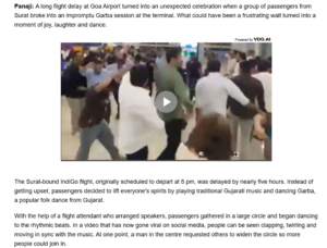 ಇದರ ನಂತರ, ಹೆಚ್ಚಿನ ಮಾಹಿತಿಗಾಗಿ ನಾವು “ಗೋವಾ ವಿಮಾನ ವಿಳಂಬ ಸೂರತ್ 30 ಸೆಪ್ಟೆಂಬರ್ 2025 ಗಾರ್ಬಾ” ಎಂಬ ಪದಗುಚ್ಛದೊಂದಿಗೆ ಅಂತರ್ಜಾಲ ಹುಡುಕಾಟವನ್ನು ನಡೆಸಿದೆವು. ಸೆಪ್ಟೆಂಬರ್ 30, 2025 ರಂದು ಪ್ರಕಟವಾದ ಇಂಡಿಯಾ ಟಿವಿ ವರದಿಯ ಪ್ರಕಾರ, “ಸೂರತ್ನ ಪ್ರಯಾಣಿಕರ ಗುಂಪೊಂದು ಆಕಸ್ಮಿಕ ಗಾರ್ಬಾ ಪ್ರಾರಂಭಿಸಿದಾಗ ಗೋವಾ ವಿಮಾನ ನಿಲ್ದಾಣದಲ್ಲಿ ದೀರ್ಘ ವಿಮಾನ ವಿಳಂಬವು ಅನಿರೀಕ್ಷಿತ ಆಚರಣೆಯಾಗಿ ಮಾರ್ಪಟ್ಟಿತು”. ಸಂಜೆ 5 ಗಂಟೆಗೆ ನಿಗದಿಯಾಗಿದ್ದ ವಿಮಾನವು “ಸುಮಾರು ಐದು ಗಂಟೆಗಳ ಕಾಲ ವಿಳಂಬವಾಯಿತು” ಎಂದು ವರದಿಯು ಮತ್ತಷ್ಟು ವಿವರ ನೀಡುತ್ತದೆ. ವರದಿಯ ಒಂದು ಭಾಗವನ್ನು ಕೆಳಗೆ ನೋಡಿ: