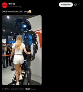ಹಲವಾರು ಸಾಮಾಜಿಕ ಮಾಧ್ಯಮ ಬಳಕೆದಾರರು ವೀಡಿಯೊವನ್ನು ಹಂಚಿಕೊಳ್ಳುತ್ತಾ 2026ರಲ್ಲಿ ಹೊಸ ರೀತಿಯ ರೋಬೋಟಿಕ್ ಸಾರಿಗೆ ಲಭ್ಯವಿದೆ ಎಂದು ಹೇಳಿಕೊಂಡಿದ್ದಾರೆ. X ಬಳಕೆದಾರ ‘TriedWrong’ ಅಂತಹ ಕ್ಲಿಪ್ ಅನ್ನು ಹಂಚಿಕೊಂಡಿದ್ದು, ಇದಕ್ಕೆ “2026 ಹೊಸ ಸಾರಿಗೆ ಮಾರ್ಗ” ಎಂಬ ಶೀರ್ಷಿಕೆ ನೀಡಿದ್ದಾರೆ. ಈ ದೃಶ್ಯಾವಳಿಯಲ್ಲಿ ನೀಲಿ ನಿಯಾನ್ ಛಾಯೆಗಳನ್ನು ಹೊಂದಿರುವ ಹೊಳೆಯುವ ಕಪ್ಪು ಹುಮನಾಯ್ಡ್ ರೋಬೋಟ್ ಅನ್ನು ತೋರಿಸಲಾಗಿದೆ, ಇದು ಟೆಸ್ಲಾ ಸಂಬಂಧಿತ ಎಂದು ಹೇಳಲಾಗಿದೆ. ಒಬ್ಬ ಮಹಿಳೆಯು ಅದರೊಂದಿಗೆ ಸಂವಹನ ನಡೆಸುತ್ತಾರೆ, ಮತ್ತು ಅದು ಬೈಪೆಡಲ್ ಸಾರಿಗೆ ಸಾಧನವಾಗಿ ರೂಪಾಂತರಗೊಳ್ಳುವಾಗ ಅದರೊಳಗೆ ಹತ್ತುತ್ತಾರೆ, ಮತ್ತದು ಆಕೆಯನ್ನು ಹೊತ್ತೊಯ್ಯುತ್ತದೆ. ಈ ರೋಬೋಟ್ 2026ಕ್ಕೆ ಟೆಸ್ಲಾದಿಂದ ಮುಂಬರುವ ನೈಜ-ಪ್ರಪಂಚದ ಸಾರಿಗೆ ಸಂಬಂಧಿತ ಆವಿಷ್ಕರವನ್ನು ಪ್ರತಿನಿಧಿಸುತ್ತದೆ ಎಂಬಂತೆ ಈ ದೃಶ್ಯದಲ್ಲಿ ಸೂಚಿಸಲಾಗಿದೆ. ಪೋಸ್ಟ್ ಅನ್ನು ಕೆಳಗೆ ನೋಡಿ-