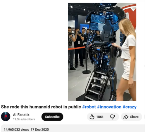ನಾವು ಮೊದಲು ವೀಡಿಯೊವನ್ನು ವಿಶ್ಲೇಷಿಸಿದಾಗ ಹೇಳಿಕೆಯಲ್ಲಿರುವ ವೀಡಿಯೊಗಳು ‘AI FANATIX – CYBER FUNK’ ವಾಟರ್ಮಾರ್ಕ್ ಹೊಂದಿರುವುದನ್ನು ಗಮನಿಸಿದೆವು. ರಿವರ್ಸ್ ಇಮೇಜ್ ಹುಡುಕಾಟವನ್ನು ನಡೆಸಿದಾಗ, ನಮಗೆ ‘AI Fanatix’ ವಾಹಿನಿಯಲ್ಲಿನ “ಆಕೆ ಈ ಹುಮನಾಯ್ಡ್ ರೋಬೋಟ್ ಅನ್ನು ಸಾರ್ವಜನಿಕವಾಗಿ ಓಡಿಸಿದಳು #ರೋಬೋಟ್ #ಇನೊವೇಶನ್ #ಕ್ರೇಜಿ” ಎಂಬ ಶೀರ್ಷಿಕೆಯ ಯೂಟ್ಯೂಬ್ ವೀಡಿಯೊ ದೊರಕಿತು. ಈ ವೀಡಿಯೊವನ್ನು ಮೊದಲು ಡಿಸೆಂಬರ್ 17, 2025 ರಂದು ಅಪ್ಲೋಡ್ ಮಾಡಲಾಗಿತ್ತು, ಸ್ಕ್ರೀನ್ಶಾಟ್ ಅನ್ನು ಕೆಳಗೆ ನೋಡಿ-