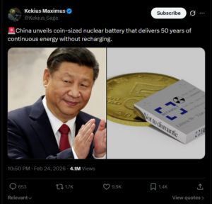 ಹಲವಾರು ಸಾಮಾಜಿಕ ಮಾಧ್ಯಮ ಬಳಕೆದಾರರು ಚೀನಾ ದೇಶವು ನಾಣ್ಯ ಗಾತ್ರದ ಪರಮಾಣು ಬ್ಯಾಟರಿಯನ್ನು ಅನಾವರಣಗೊಳಿಸಿದೆ ಎಂದು ಹೇಳಿಕೊಂಡಿದ್ದಾರೆ. ದೃಢೀಕೃತ X ಬಳಕೆದಾರ ‘Kekius_Sage’ ಅಂತಹ ಪೋಸ್ಟ್ ಹಂಚಿಕೊಂಡಿದ್ದು, ಚೀನಾ ದೇಶವು ರೀಚಾರ್ಜ್ ಮಾಡದೆಯೇ 50 ವರ್ಷಗಳ ನಿರಂತರ ಶಕ್ತಿಯನ್ನು ಒದಗಿಸುವ ನಾಣ್ಯ ಗಾತ್ರದ ಪರಮಾಣು ಬ್ಯಾಟರಿಯನ್ನು ಅನಾವರಣಗೊಳಿಸಿದೆ ಎಂದು ಹೇಳಿಕೊಂಡಿದ್ದಾರೆ. ಪೋಸ್ಟ್ ಜೊತೆಗೆ ಎರಡು ಚಿತ್ರಗಳಿವೆ, ಒಂದರಲ್ಲಿ ಚೀನೀ ಅಧ್ಯಕ್ಷ ಕ್ಸಿ ಜಿನ್‌ಪಿಂಗ್ ಅವರನ್ನು ತೋರಿಸಲಾಗಿದ್ದರೆ ಮತ್ತೊಂದು ‘ಬೀಟಾವೋಲ್ಟ್’ ಎಂದು ಬರೆದಿರುವ ನಾಣ್ಯದಂತಹ ಉಪಕರಣದಂತೆ ಕಾಣುತ್ತದೆ. ಈ ಪೋಸ್ಟ್ ಗೆ 4.1 ಮಿಲಿಯ ವೀಕ್ಷಣೆಗಳು ದೊರಕಿವೆ, ಅದನ್ನು ಕೆಳಗೆ ನೋಡಬಹುದು –