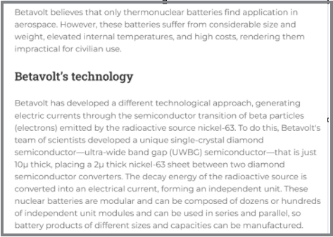 ಇದರ ನಂತರ, ವರ್ಲ್ಡ್ ನ್ಯೂಕ್ಲಿಯರ್ ನ್ಯೂಸ್‌ನ ಮತ್ತೊಂದು ವರದಿಯು ನಮ್ಮ ಕೈಬಿತ್ತು, ಇದರಲ್ಲಿಯೂ ಹೇಳಿಕೆಯಲ್ಲಿ ತೋರಿಸಿರುವಂಥದ್ದೇ ಚಿತ್ರವನ್ನು ಬಳಸಲಾಗಿದೆ. ಈ ವರದಿಯಲ್ಲಿ “ಕಂಪನಿಯು ಬಿಡುಗಡೆ ಮಾಡಲು ಯೋಜಿಸಿರುವ ಮೊದಲ ಬ್ಯಾಟರಿ BV100 ಆಗಿದೆ, ಇದು ಬೃಹತ್ ಉತ್ಪಾದನೆಯಾಗುವ ವಿಶ್ವದ ಮೊದಲ ಪರಮಾಣು ಬ್ಯಾಟರಿಯಾಗಲಿದೆ ಎಂದು ಅದು ಹೇಳುತ್ತದೆ” ಎಂದು ಉಲ್ಲೇಖಿಸಲಾಗಿದೆ. ಗಾತ್ರವನ್ನು ನೋಡುವುದಾದರೆ, ಬ್ಯಾಟರಿಯ ಅಳತೆ “15mm x 15mm ಮತ್ತು 5 mm ದಪ್ಪವನ್ನು ಹೊಂದಿದೆ… ಇದು 3V ವೋಲ್ಟೇಜ್‌ನ 100 ಮೈಕ್ರೋವ್ಯಾಟ್‌ಗಳನ್ನು ಉತ್ಪಾದಿಸಬಹುದು”. ಒಂದು ಭಾಗವನ್ನು ಕೆಳಗೆ ನೋಡಿ-