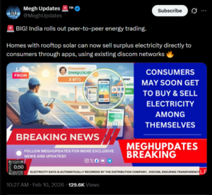 ಭಾರತವು ಪೀರ್-ಟು-ಪೀರ್ ಇಂಧನ ವ್ಯಾಪಾರವನ್ನು ಪ್ರಾರಂಭಿಸಿದೆ ಎಂಬುದರ ಕುರಿತು ಹಲವಾರು ಸಾಮಾಜಿಕ ಮಾಧ್ಯಮ ಬಳಕೆದಾರರು ಹೇಳಿಕೆಯನ್ನು ಹಂಚಿಕೊಂಡಿದ್ದಾರೆ. ದೃಢೀಕೃತ X ಖಾತೆ ‘MeghUpdates’ ಈ ಶೀರ್ಷಿಕೆಯೊಂದಿಗೆ ಅಂತಹ ಹೇಳಿಕೆಯನ್ನು ನೀಡಿದ್ದಾರೆ: “ದೊಡ್ಡ ಸುದ್ದಿ! ಭಾರತವು ಪೀರ್-ಟು-ಪೀರ್ ಇಂಧನ ವ್ಯಾಪಾರವನ್ನು ಹೊರತರುತ್ತಿದೆ. ಮೇಲ್ಛಾವಣಿಯ ಸೌರಶಕ್ತಿ ಉಪಕರಣವನ್ನು ಹೊಂದಿರುವ ಮನೆಗಳು ಈಗ ಹೆಚ್ಚುವರಿ ವಿದ್ಯುತ್ ಅನ್ನು ಅಸ್ತಿತ್ವದಲ್ಲಿರುವ ಡಿಸ್ಕಾಮ್ ನೆಟ್ವರ್ಕ್ಗಳನ್ನು ಬಳಸಿ ಅಪ್ಲಿಕೇಶನ್ಗಳ ಮೂಲಕ ಗ್ರಾಹಕರಿಗೆ ನೇರವಾಗಿ ಮಾರಾಟ ಮಾಡಬಹುದು.” ಈ ಸೇವೆಯು ಈಗಾಗಲೇ ಲೈವ್ ಆಗಿದೆ ಮತ್ತು ರಾಷ್ಟ್ರವ್ಯಾಪಿಯಾಗಿ ಮತ್ತು ಸಾರ್ವಜನಿಕರಿಗೆ ಲಭ್ಯವಿದೆ ಎಂದು ಈ ಪೋಸ್ಟ್ ಸೂಚಿಸುತ್ತದೆ. ಪೋಸ್ಟ್ ಅನ್ನು ಕೆಳಗೆ ನೋಡಿ-
