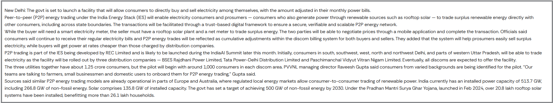 ಇನ್ನಷ್ಟು ತಿಳಿದುಕೊಳ್ಳಲು ನಾವು ಮೊದಲು “ಭಾರತ ಪೀರ್ ಟು ಪೀರ್ ಎನರ್ಜಿ ಟ್ರೇಡಿಂಗ್ ಅನ್ನು ಪ್ರಾರಂಭಿಸಿದೆ” ಎಂಬ ಪದಗಳೊಂದಿಗೆ ಅಂತರ್ಜಾಲದ ಹುಡುಕಾಟವನ್ನು ನಡೆಸಿದೆವು. TOI ವರದಿಯ ಪ್ರಕಾರ, ಸರ್ಕಾರವು ಈ ಸೌಲಭ್ಯವನ್ನು ಬಿಡುಗಡೆ ಮಾಡಲು ಸಿದ್ಧವಾಗಿದೆ, ಇದರಡಿಯಲ್ಲಿ ಗ್ರಾಹಕರು “ತಮ್ಮೊಳಗೆ ನೇರವಾಗಿ ವಿದ್ಯುತ್ ಖರೀದಿಸಲು ಮತ್ತು ಮಾರಾಟ ಮಾಡಲು” ಅವಕಾಶವಿರುತ್ತದೆ. “P2P ವ್ಯಾಪಾರವು REC ಲಿಮಿಟೆಡ್ ಅಭಿವೃದ್ಧಿಪಡಿಸುತ್ತಿರುವ IES ನ ಭಾಗವಾಗಿದೆ” ಮತ್ತು ಫೆಬ್ರವರಿ 2026ರ ಕೊನೆಗೆ ಇಂಡಿಯಾAI ಶೃಂಗಸಭೆಯಲ್ಲಿ ಇದನ್ನು ಪ್ರಾರಂಭಿಸಲಾಗುವುದು ಎಂದು ವರದಿಯು ಹೇಳಿದೆ. ವರದಿಯ ಒಂದು ಭಾಗವನ್ನು ಕೆಳಗೆ ನೋಡಿ –