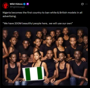 ನೈಜೀರಿಯಾ ದೇಶವು ಜಾಹೀರಾತು ಉದ್ಯಮದಲ್ಲಿ ಬಿಳಿಯರು ಮತ್ತು ಬ್ರಿಟಿಷ್ ಮಾಡೆಲ್ ಗಳನ್ನು ನಿಷೇಧಿಸಿದ ಮೊದಲ ದೇಶವಾಗಿದೆ ಎಂಬ ಹೇಳಿಕೆಯನ್ನು ಹಲವಾರು ಸಾಮಾಜಿಕ ಮಾಧ್ಯಮ ಬಳಕೆದಾರರು ಹಂಚಿಕೊಂಡಿದ್ದಾರೆ. ದೃಢೀಕೃತ X ಬಳಕೆದಾರ ‘ಫೈಟ್ಸ್ಟೋರೇಜ್’ ಈ ಹೇಳಿಕೆಯನ್ನು ಈ ಮುಂದಿನ ಶೀರ್ಷಿಕೆಯೊಂದಿಗೆ ಹಂಚಿಕೊಂಡಿದ್ದಾರೆ: ‘ನೈಜೀರಿಯಾವು ಎಲ್ಲಾ ಜಾಹೀರಾತುಗಳಲ್ಲಿ ಬಿಳಿ ಮತ್ತು ಬ್ರಿಟಿಷ್ ಮಾಡೆಲ್ ಗಳನ್ನು ನಿಷೇಧಿಸಿದ ಮೊದಲ ದೇಶವಾಗಿದೆ. “ನಮ್ಮಲ್ಲಿ 200 ಮಿಲಿಯ ಸುಂದರ ಜನರಿದ್ದಾರೆ.. ನಾವು ನಮ್ಮವರನ್ನೇ ಬಳಸೋಣ”. ಇದರಲ್ಲಿ ರಾಷ್ಟ್ರಧ್ವಜವನ್ನು ಹಿಡಿದಿರುವ ನೈಜೀರಿಯನ್ ಮಾಡೆಲ್ ಗಳ ಗುಂಪಿನ ಚಿತ್ರವನ್ನು ಒಳಗೊಂಡಿದೆ. ಈ ಪೋಸ್ಟ್ 1.2 ಮಿಲಿಯಕ್ಕಿಂತಲೂ ಹೆಚ್ಚು ವೀಕ್ಷಣೆಗಳನ್ನು ಗಳಿಸಿದೆ ಮತ್ತು ಇದನ್ನು ಕೆಳಗೆ ನೋಡಬಹುದು –