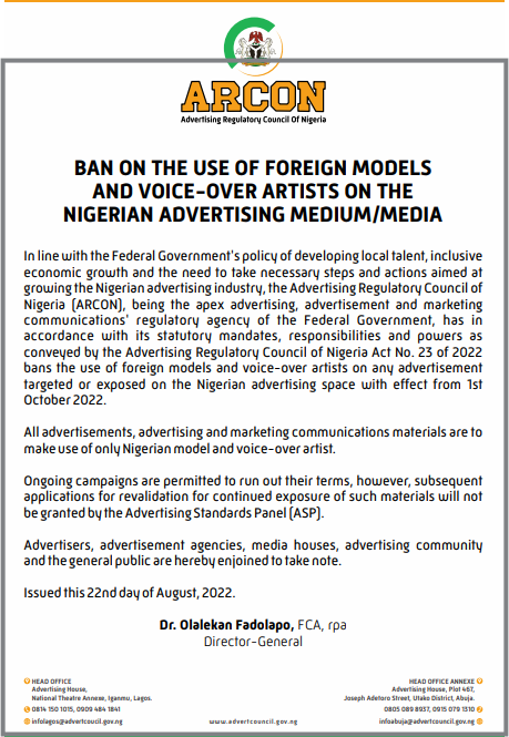 ಇದರ ನಂತರ, ನಾವು ನೈಜೀರಿಯಾದ ಜಾಹೀರಾತು ನಿಯಂತ್ರಣ ಮಂಡಳಿಯ (ARCON) ಅಧಿಕೃತ ಸೂಚನೆಯನ್ನು ಹುಡುಕಿದೆವು. ಆಗಸ್ಟ್ 22, 2022 ರಂದು 2022 ರ ARCON ಕಾಯ್ದೆ ಸಂಖ್ಯೆ 23ರ ಅಡಿಯಲ್ಲಿ ಹೊರಡಿಸಲಾದ ಇದು, “ಅಕ್ಟೋಬರ್ 1, 2022ರಿಂದ ಜಾರಿಗೆ ಬರುವಂತೆ ನೈಜೀರಿಯನ್ ಜಾಹೀರಾತು ಸ್ಥಳಗಳನ್ನು ಗುರಿಯಾಗಿಸಿದ ಅಥವಾ ಬಹಿರಂಗಪಡಿಸಿದ ಯಾವುದೇ ಜಾಹೀರಾತಿನಲ್ಲಿ ವಿದೇಶಿ ಮಾಡೆಲ್ಗಳು ಮತ್ತು ಧ್ವನಿ ಕಲಾವಿದರ ಬಳಕೆಯನ್ನು ನಿಷೇಧಿಸುತ್ತದೆ”. ಮುಂದುವರೆದು “ಎಲ್ಲಾ ಜಾಹೀರಾತುಗಳು… ನೈಜೀರಿಯನ್ ಮಾಡೆಲ್ ಮತ್ತು ಧ್ವನಿ ಕಲಾವಿದರನ್ನು ಮಾತ್ರ ಬಳಸಬೇಕು” ಎಂದು ನಿರ್ದೇಶನವು ಹೇಳುತ್ತದೆ. ನಡೆಯುತ್ತಿರುವ ಅಭಿಯಾನಗಳಿಗೆ ಅವುಗಳ ಅವಧಿ ಮುಗಿಸಲು ಅವಕಾಶವಿದೆ, ಆದಾಗ್ಯೂ, ಅಂತಹ ಜಾಹೀರಾತುಗಳ ನಿರಂತರ ಬಳಕೆಗಾಗಿ ಮರುಮೌಲ್ಯಮಾಪನಕ್ಕಾಗಿ ಸಲ್ಲಿಸುವ ನಂತರದ ಅರ್ಜಿಗಳನ್ನು ಅನುಮೋದಿಸಲಾಗುವುದಿಲ್ಲ…” ನಿರ್ದೇಶನವನ್ನು ಕೆಳಗೆ ನೋಡಿ-