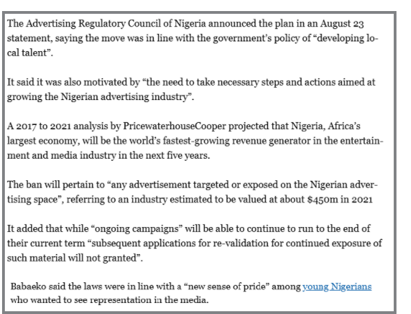 ಓಕೆಆಫ್ರಿಕಾ ಪ್ರಕಟಿಸಿದ ಮತ್ತೊಂದು ವರದಿಯು ಜಾಹೀರಾತುಗಳಲ್ಲಿ ವಿದೇಶಿ ಮಾಡೆಲ್ ಗಳನ್ನು ನಿಷೇಧಿಸುವ ನೈಜೀರಿಯಾದ ಕ್ರಮವನ್ನು ದೃಢಪಡಿಸುತ್ತದೆ. “ನೈಜೀರಿಯಾದ ಜಾಹೀರಾತು ಉದ್ಯಮವನ್ನು ಒಟ್ಟಾರೆಯಾಗಿ ಬೆಳೆಸುವ ಗುರಿಯನ್ನು ಹೊಂದಿರುವ ಸರ್ಕಾರಿ ನೀತಿಗಳಿಗೆ ಅನುಗುಣವಾಗಿ ಕೈಗೊಂಡಿರುವ ಕ್ರಮವೆಂದು ಸೂಚಿಸಿ ನೈಜೀರಿಯಾದ ಜಾಹೀರಾತು ನಿಯಂತ್ರಣ ಮಂಡಳಿ (ARCON) ಈ ಯೋಜನೆಯನ್ನು ಘೋಷಿಸಿತು” ಎಂದು ವರದಿ ಹೇಳುತ್ತದೆ. ಆದಾಗ್ಯೂ, ಜನಾಂಗೀಯ ಕೋನವಿದೆ ಅಥವಾ ನಿಷೇಧವನ್ನು ನಿರ್ದಿಷ್ಟವಾಗಿ ಬಿಳಿಯರು ಅಥವಾ ಬ್ರಿಟಿಷ್ ವಿದೇಶಿ ಪ್ರಜೆಗಳನ್ನು ಗುರಿಯಾಗಿಸಿಕೊಂಡಿದೆ ಎಂಬುದಕ್ಕೆ ಯಾವುದೇ ಪುರಾವೆಗಳಿಲ್ಲ.