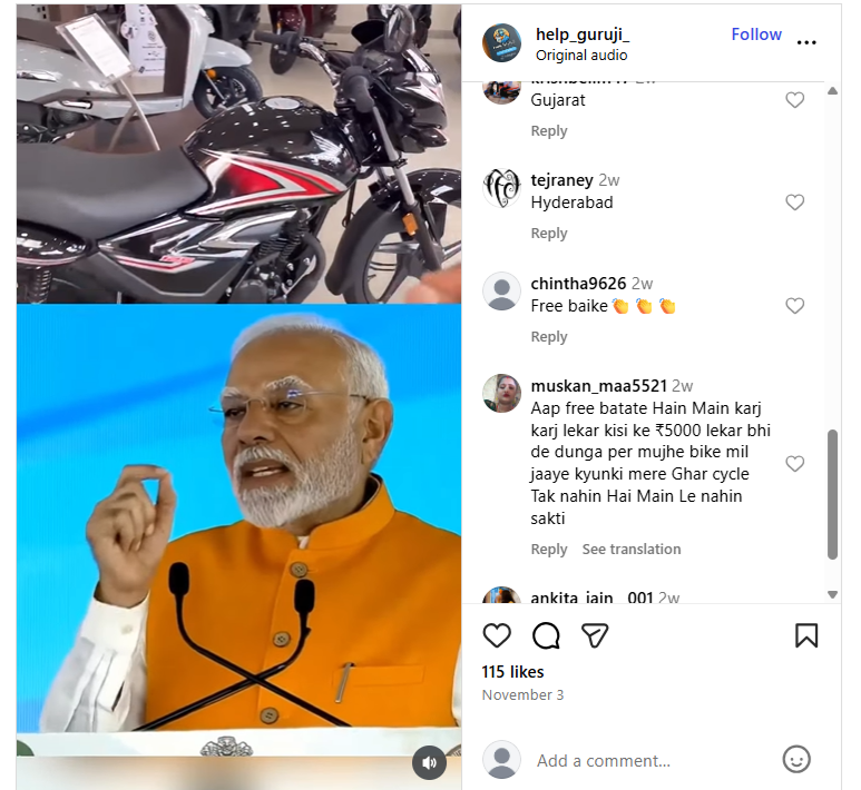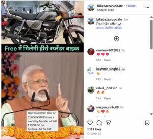 ಪ್ರಧಾನಿ ನರೇಂದ್ರ ಮೋದಿಯವರು ಆಧಾರ್ ಕಾರ್ಡ್ ಹೊಂದಿರುವ ಎಲ್ಲಾ ಭಾರತೀಯ ನಾಗರಿಕರಿಗೆ ಉಚಿತ ಸ್ಪ್ಲೆಂಡರ್ ಬೈಕ್ ಯೋಜನೆಯನ್ನು ಘೋಷಿಸಿದ್ದಾರೆ ಎಂದು ಹೇಳಿಕೊಳ್ಳುತ್ತಾ ಹಲವಾರು ಬಳಕೆದಾರರು ರೀಲ್ ಅನ್ನು ಹಂಚಿಕೊಂಡಿದ್ದಾರೆ. ಇನ್ಸ್ಟಾಗ್ರಾಮ್ ಬಳಕೆದಾರ ‘bikebazzarupdate’ ಅಂತಹ ರೀಲ್ ಅನ್ನು ಹಂಚಿಕೊಳ್ಳುತ್ತಾ, ಈ ಆಫರ್ ಅನ್ನು ಪಡೆಯಲು ಜನರು ಅದನ್ನು ಇತರ 4 ಜನ ಸ್ನೇಹಿತರೊಂದಿಗೆ ಹಂಚಿಕೊಳ್ಳಬೇಕೆಂದು ಮತ್ತು ನೀಡಿರುವ ಅಕೌಂಟ್ ಫಾಲೊ ಮಾಡಿ ತಮ್ಮ ವಿವರಗಳನ್ನು ಹಂಚಿಕೊಳ್ಳಬೇಕೆಂದು ಒತ್ತಾಯಿಸಿದರು. ಪೋಸ್ಟ್ ಅನ್ನು ಕೆಳಗೆ ನೋಡಿ-
