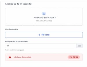 ಕೊನೆಯದಾಗಿ, ಹಲವಾರು ಆಡಿಯೊ ಓವರ್ಲೇಗಳು ಮತ್ತು ಲಿಪ್-ಸಿಂಕ್ ಭಿನ್ನತೆಗಳನ್ನು ಕಂಡುಕೊಂಡ ನಂತರ, ನಾವು ರೀಲ್ನಿಂದ ಆಡಿಯೊವನ್ನು ಹೊರತೆಗೆದು ಅದನ್ನು AI ಆಡಿಯೊ ಡಿಟೆಕ್ಟರ್ನಲ್ಲಿ ಇರಿಸಿದೆವು. ಈ ಆಡಿಯೋ ಬಹುಶಃ AI ನಿಂದ ಉತ್ಪತ್ತಿಯಾಗಿರುವಂಥದ್ದು ಮತ್ತು ಅದರಲ್ಲಿ ಕೇವಲ 1% ಮಾತ್ರ ನಿಜವಾಗಿದೆ ಎಂದು ಫಲಿತಾಂಶಗಳು ಬಹಿರಂಗಪಡಿಸಿವೆ. ಫಲಿತಾಂಶಗಳನ್ನು ಕೆಳಗೆ ನೋಡಿ: