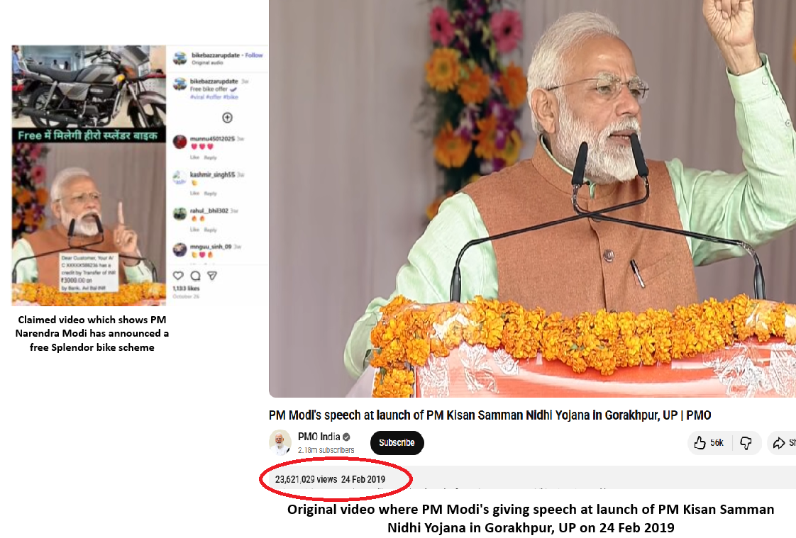 ಉತ್ತರ ಪ್ರದೇಶದ ಗೋರಖ್ಪುರದಲ್ಲಿ 2019ರಲ್ಲಿ ನಡೆದ ಪ್ರಧಾನ ಮಂತ್ರಿ ಕಿಸಾನ್ ಸಮ್ಮಾನ್ ನಿಧಿ ಯೋಜನೆಯ ಉದ್ಘಾಟನಾ ಕಾರ್ಯಕ್ರಮದ ಸಂದರ್ಭದಲ್ಲಿ ಪ್ರಧಾನಿ ಮೋದಿಯವರ ಭಾಷಣವನ್ನು ಮೂಲ ವೀಡಿಯೊ ವಿವರಿಸುತ್ತದೆ. ಅದರ ವೀಡಿಯೊವನ್ನು ಕೆಳಗೆ ವೀಕ್ಷಿಸಿ: