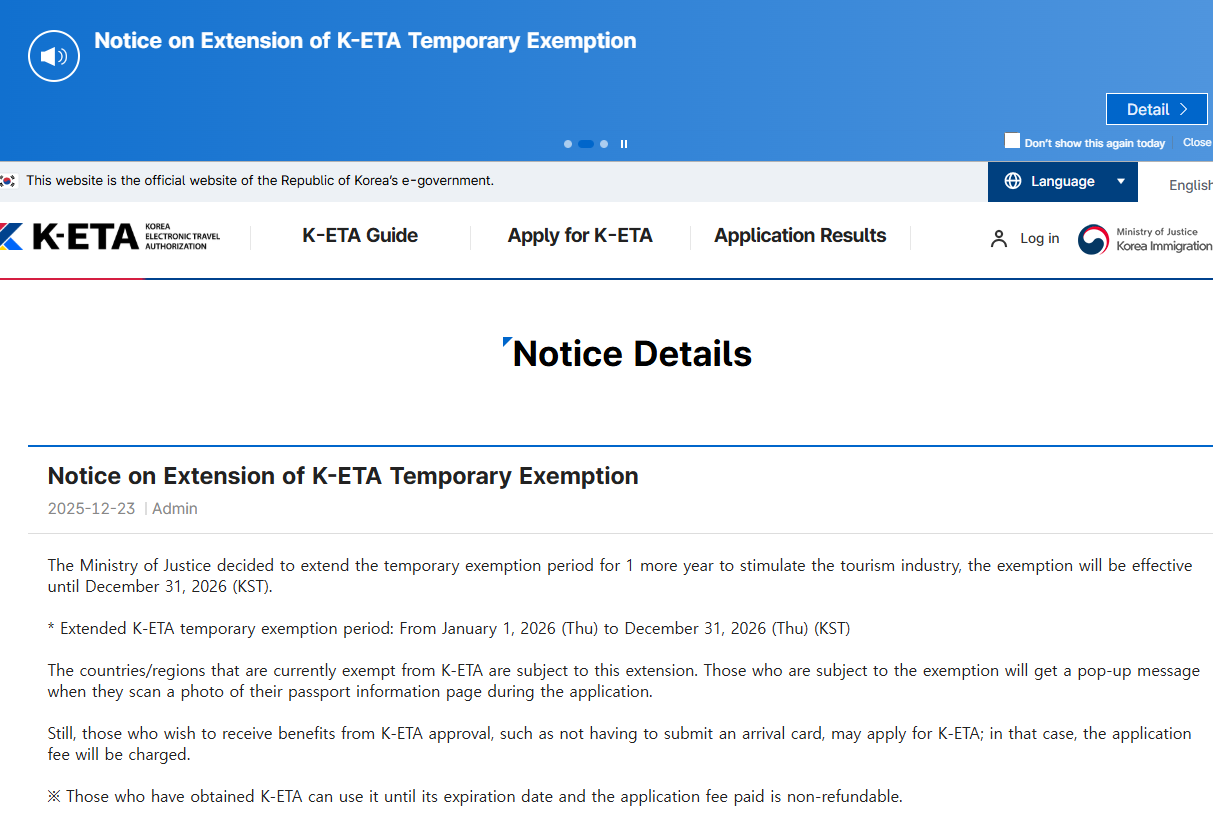 ಇದರ ನಂತರ ನಾವು ದಕ್ಷಿಣ ಕೊರಿಯಾದ ಅಧಿಕಾರಿಗಳಿಂದ K-ETA ವಿನಾಯಿತಿಯ ಅಧಿಕೃತ ಸೂಚನೆಯನ್ನು ಹುಡುಕಿದೆವು. ಡಿಸೆಂಬರ್ 23, 2025 ರಂದು, ದಕ್ಷಿಣ ಕೊರಿಯಾ K-ETA ವೆಬ್‌ಸೈಟ್‌ನಲ್ಲಿ “ವಿನಾಯಿತಿಯು ಡಿಸೆಂಬರ್ 31, 2026 ರವರೆಗೆ ಜಾರಿಯಲ್ಲಿರುತ್ತದೆ” ಎನ್ನುವ ಅಧಿಕೃತ ಸೂಚನೆಯನ್ನು ಬಿಡುಗಡೆ ಮಾಡಲಾಯಿತು. ಅಂದರೆ ಜನವರಿ 1, 2026 ರಿಂದ ಡಿಸೆಂಬರ್ 31, 2026 ರವರೆಗಿನ ಈ ಅವಧಿಯಲ್ಲಿ, 22 ರಾಷ್ಟ್ರೀಯತೆಗಳ ಗುಂಪುಗಳು (ಇಸ್ರೇಲಿಗಳು ಸೇರಿದಂತೆ) K-ETAಗೆ ಅರ್ಜಿ ಸಲ್ಲಿಸದೆ ದಕ್ಷಿಣ ಕೊರಿಯಾವನ್ನು ಪ್ರವೇಶಿಸಲು ಸಾಧ್ಯವಾಗುತ್ತದೆ.