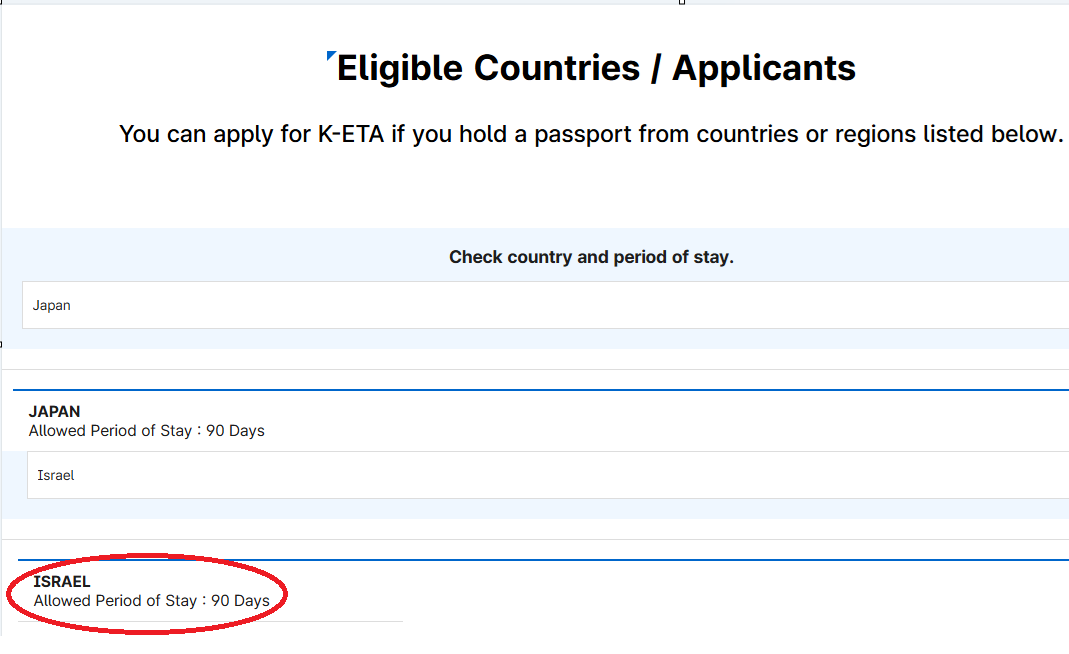 ಅಂತಿಮವಾಗಿ, K ETA ಅನ್ವಯವಾಗುವ ದೇಶಗಳಿಗೆ ಅರ್ಹತೆ ಮತ್ತು ಅರ್ಜಿದಾರರ ಪುಟವನ್ನು ನಾವು ಪರಿಶೀಲಿಸಿದೆವು. ಅಧಿಕೃತ ವೆಬ್‌ಸೈಟ್ ನಲ್ಲಿ ಇಸ್ರೇಲ್ ಅನ್ನು ವಿನಾಯಿತಿ ಪಡೆದ ದೇಶದ ಪಟ್ಟಿಯಲ್ಲಿ ಸೂಚಿಸಲಾಗಿದೆ, ಕೆಳಗೆ ಕಾಣುವ ವಾಸದ ಅವಧಿಯನ್ನು 90 ದಿನಗಳು ಎಂದು ತೋರಿಸಲಾಗಿದೆ. ಯಾವುದೇ ಬದಲಾವಣೆಗಳನ್ನು ಮಾಡಲಾಗಿಲ್ಲ ಮತ್ತು ಇಸ್ರೇಲಿ ಪ್ರವಾಸಿಗರು ದಕ್ಷಿಣ ಕೊರಿಯಾದೊಳಗೆ ಈಗಲೂ ಸ್ವಾಗತಾರ್ಹರು.