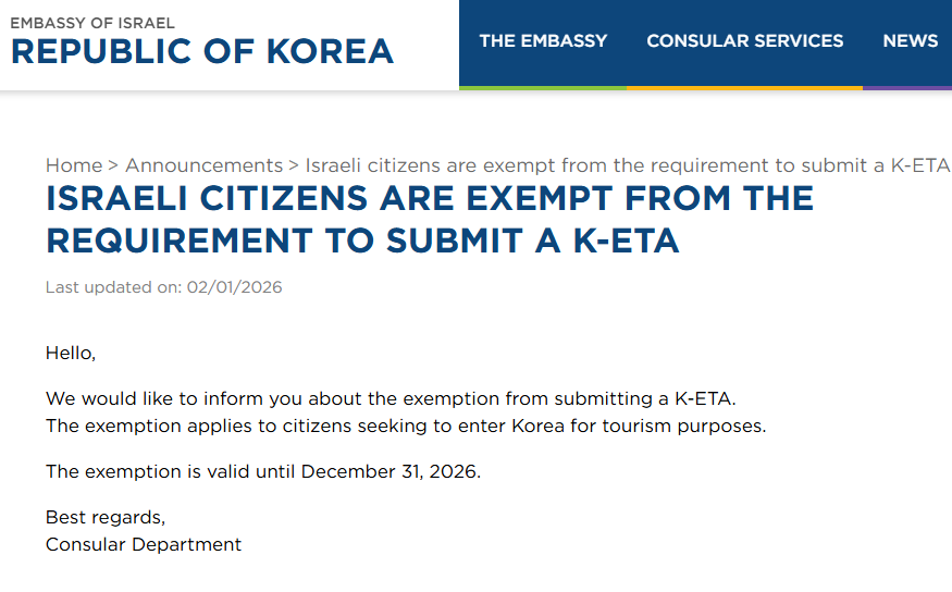 ಇದರ ನಂತರ, ಇಸ್ರೇಲಿ ಪಾಸ್‌ಪೋರ್ಟ್ ಹೊಂದಿರುವವರು ಡಿಸೆಂಬರ್ 31, 2026 ರವರೆಗೆ ಕೊರಿಯಾ ಎಲೆಕ್ಟ್ರಾನಿಕ್ ಪ್ರಯಾಣ ಆಥರೈಸೇಶನ್ (K-ETA) ಅವಶ್ಯಕತೆಯಿಂದ ಸ್ಪಷ್ಟ ವಿನಾಯಿತಿ ಪಡೆದಿದ್ದಾರೆ ಎಂದು ನಮಗೆ ವರದಿಯಿಂದ ತಿಳಿದುಬಂತು, ಈ ಮೂಲಕ ಪ್ರವಾಸಕ್ಕಾಗಿ 90 ದಿನಗಳವರೆಗೆ ವೀಸಾ-ಮುಕ್ತ ವಾಸ್ತವ್ಯವನ್ನು ಪಡೆಯಬಹುದು. 2025ರ ಕೊನೆಯಲ್ಲಿ ಘೋಷಿಸಲಾದ ಇತ್ತೀಚಿನ ಈ ವಿಸ್ತರಣೆಯು ಡಿಸೆಂಬರ್ 31, 2026 ರವರೆಗೆ ಈ ವಿನಾಯಿತಿಯನ್ನು ಸಕ್ರಿಯವಾಗಿರಿಸುತ್ತದೆ. ಕೊರಿಯಾದಲ್ಲಿರುವ ಇಸ್ರೇಲ್ ರಾಯಭಾರ ಕಚೇರಿಯ ಈ ಪ್ರಕಟಣೆಯ ಸ್ಕ್ರೀನ್‌ಶಾಟ್ ಅನ್ನು ಕೆಳಗೆ ನೋಡಿ-