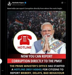 ಭ್ರಷ್ಟಾಚಾರವನ್ನು ನಿಭಾಯಿಸಲು ಭಾರತದ ಪ್ರಧಾನ ಮಂತ್ರಿಗಳ ಕಚೇರಿ ನಾಗರಿಕರಿಗಾಗಿ ಹಾಟ್ಲೈನ್ (9851145045) ಅನ್ನು ಪ್ರಾರಂಭಿಸಿದೆ ಎಂದು ಹಲವಾರು ಸಾಮಾಜಿಕ ಮಾಧ್ಯಮ ಬಳಕೆದಾರರು ಹೇಳಿಕೊಂಡಿದ್ದಾರೆ. ದೃಢೀಕೃತ X ಬಳಕೆದಾರ ‘RavinderKapur2’ ರವರು “ಇನ್ನೀಗ ಭಾರತವು ಭ್ರಷ್ಟಾಚಾರವನ್ನು ಬುಡದಿಂದಲೇ ನೇರವಾಗಿ ವರದಿ ಮಾಡಬಹುದು” ಎಂಬ ಶೀರ್ಷಿಕೆಯೊಂದಿಗೆ ಅಂತಹ ಒಂದು ಹೇಳಿಕೆಯನ್ನು ಹಂಚಿಕೊಂಡಿದ್ದಾರೆ.