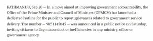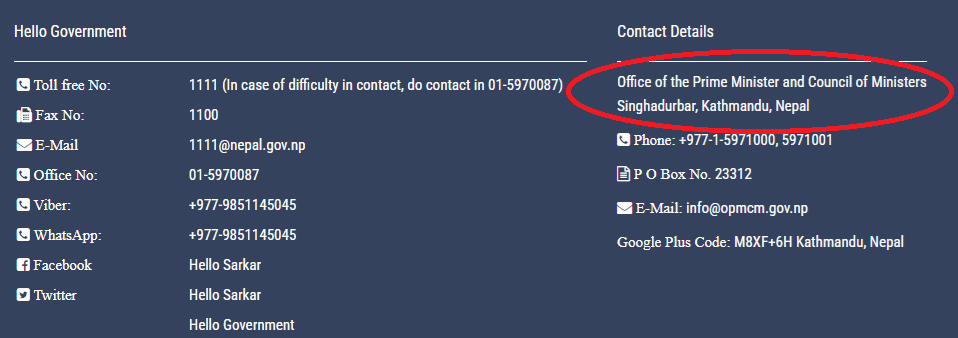 ನೇಪಾಳದ ಪ್ರಧಾನ ಮಂತ್ರಿ ಕಚೇರಿ ಮತ್ತು ಮಂತ್ರಿ ಮಂಡಳಿಯ (OPMCM) ಅಧಿಕೃತ ವೆಬ್ಸೈಟ್ನಲ್ಲಿ ಹುಡುಕಿದಾಗ, “ಹಲೋ ಸರ್ಕಾರ” ವಿಭಾಗದ ಅಡಿಯಲ್ಲಿ ಇದೇ ಸಂಖ್ಯೆಯು ನಮಗೆ ದೊರಕಿತು. ಪುಟದ ಸ್ಕ್ರೀನ್ಶಾಟ್ ಅನ್ನು ಕೆಳಗೆ ವೀಕ್ಷಿಸಿ –