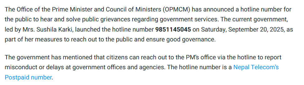 ಹಾಟ್ಲೈನ್ ಸಂಖ್ಯೆಯನ್ನು ಮಾತ್ರ ಬಳಸಿ ಮತ್ತೊಂದು ಅಂತರ್ಜಾಲದ ಹುಡುಕಾಟವನ್ನು ನಡೆಸಿದ ನಂತರ, ಈ ಹಾಟ್ಲೈನ್ ಭಾರತದ್ದಲ್ಲ, ನೇಪಾಳದ್ದು ಎಂದು ನಮಗೆ ತಿಳಿದುಬಂತು. ರಿಪಬ್ಲಿಕಾದ ವರದಿಯ ಪ್ರಕಾರ, 9851145045 ಸಂಖ್ಯೆಯು ನೇಪಾಳದ ಪ್ರಧಾನ ಮಂತ್ರಿ ಕಚೇರಿ ಮತ್ತು ಮಂತ್ರಿ ಮಂಡಳಿಗೆ (OPMCM) ಸೇರಿದ್ದು, ಸರ್ಕಾರಿ ಸಂಸ್ಥೆಗಳಲ್ಲಿ ದುಷ್ಕೃತ್ಯ, ಲಂಚ ಅಥವಾ ವಿಳಂಬಗಳನ್ನು ವರದಿ ಮಾಡಲು ನೇಪಾಳದ ಪ್ರಧಾನಿ ಸುಶೀಲಾ ಕರ್ಕಿಯವರು ಇದನ್ನು ಪ್ರಾರಂಭಿಸಿದರು. ವರದಿಯ ಒಂದು ಭಾಗವನ್ನು ಕೆಳಗೆ ನೋಡಿ-
