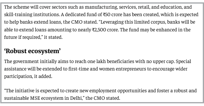 ದೆಹಲಿಯು ಸಣ್ಣ ಉದ್ಯಮಿಗಳಿಗಾಗಿ ಮೇಲಾಧಾರ ರಹಿತ ಸಾಲ ಯೋಜನೆಯನ್ನು ಪ್ರಾರಂಭಿಸಿದೆ ಎಂದು TOI ವರದಿ ದೃಢಪಡಿಸಿದೆ. ಈ ಕಾರ್ಯಕ್ರಮಕ್ಕಾಗಿ “50 ಕೋಟಿ ರೂ. ಮೀಸಲು ನಿಧಿ”ಯನ್ನು ರಚಿಸಲಾಗಿದೆ ಎಂದು ವರದಿಯಲ್ಲಿ ಉಲ್ಲೇಖಿಸಲಾಗಿದೆ. ಸುಮಾರು 2,500 ಕೋಟಿ ರೂ.ಗಳ ಬಳಕೆ ಸಾಮರ್ಥ್ಯದೊಂದಿಗೆ, ಬ್ಯಾಂಕುಗಳು ಗಮನಾರ್ಹವಾಗಿ ಹೆಚ್ಚಿನ ಸಾಲವನ್ನು ನೀಡಲು ಸಾಧ್ಯವಾಗುತ್ತದೆ ಮತ್ತು ಭವಿಷ್ಯದಲ್ಲಿ ಕಾರ್ಪಸ್ ಅನ್ನು ಹೆಚ್ಚಿಸಬಹುದು. ಹೇಳಿಕೆಯಲ್ಲಿ ತೋರಿಸಿರುವಂತೆ ಸಿಎಂ ರೇಖಾ ಗುಪ್ತಾರವರು 2,500 ಕೋಟಿ ಜನರ ಬಗ್ಗೆ ಮಾತನಾಡಿದ್ದಾರೆ ಎಂದು ವರದಿಗಳಲ್ಲಿ ಎಲ್ಲಿಯೂ ಉಲ್ಲೇಖಿಸಲಾಗಿಲ್ಲ ಅಥವಾ ಹೇಳಲಾಗಿಲ್ಲ. TOI ವರದಿಯ ಭಾಗವನ್ನು ಕೆಳಗೆ ನೋಡಿ: