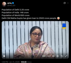 ದೆಹಲಿ ಸಿಎಂ ರೇಖಾ ಗುಪ್ತಾ ರವರು 2,500 ಕೋಟಿ ಜನರು ಒಂದು ಯೋಜನೆಯಡಿ ಸಾಲ ಪಡೆಯಬಹುದು ಎಂದು ಹೇಳಿದ್ದಾರೆನ್ನುವ ವೀಡಿಯೊವನ್ನು ಹಲವಾರು ಸಾಮಾಜಿಕ ಮಾಧ್ಯಮ ಬಳಕೆದಾರರು ಹಂಚಿಕೊಂಡಿದ್ದಾರೆ. ದೃಢೀಕೃತ X ಬಳಕೆದಾರ ‘nkk_123’ ಅಂತಹ ಒಂದು ಪೋಸ್ಟ್ ಅನ್ನು ಈ ಮುಂದಿನ ಶೀರ್ಷಿಕೆಯೊಂದಿಗೆ ಹಂಚಿಕೊಂಡಿದ್ದಾರೆ “ದೆಹಲಿಯ ಜನಸಂಖ್ಯೆ 2.25 ಕೋಟಿ. ಭಾರತದ ಜನಸಂಖ್ಯೆ 146 ಕೋಟಿ. ವಿಶ್ವದ ಜನಸಂಖ್ಯೆ 830 ಕೋಟಿ. ದೆಹಲಿ ಸಿಎಂ ರೇಖಾ ಗುಪ್ತಾರವರು 2500 ಕೋಟಿ ಜನರಿಗೆ ಸಾಲ ನೀಡಿದ್ದಾರೆ”. ಇದು ಈ ಹೇಳಿಕೆಯನ್ನು ಅಪಹಾಸ್ಯ ಮಾಡುವ ಪ್ರಯತ್ನವಾಗಿತ್ತು. ಈ ಪೋಸ್ಟ್ ಗೆ 108,000 ಕ್ಕೂ ಹೆಚ್ಚು ವೀಕ್ಷಣೆಗಳು ದೊರಕಿವೆ ಮತ್ತು ಅದನ್ನು ಕೆಳಗೆ ನೋಡಬಹುದು: