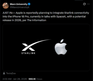 ಇತ್ತೀಚೆಗೆ, ಹಲವಾರು ಸಾಮಾಜಿಕ ಮಾಧ್ಯಮ ಬಳಕೆದಾರರು ಆಪಲ್ ತನ್ನ ಐಫೋನ್ 18 ಪ್ರೊಗೆ ಸ್ಟಾರ್ಲಿಂಕ್ ಕನೆಕ್ಟಿವಿಟಿ ಸಂಯೋಜಿಸಲು ಯೋಜಿಸುತ್ತಿದೆ ಎಂದು ಹೇಳಿಕೊಂಡಿದ್ದಾರೆ. ದೃಢೀಕೃತ X ಬಳಕೆದಾರ ‘MarsUniversityX’ ಅಂತಹ ಹೇಳಿಕೆಯನ್ನು ನೀಡಿದ್ದು 2026ರಲ್ಲಿ ಸಂಭಾವ್ಯ ಬಿಡುಗಡೆಗಾಗಿ ಆಪಲ್ ಮತ್ತು ಸ್ಪೇಸ್X ನಡುವೆ ನಡೆಯುತ್ತಿರುವ ಮಾತುಕತೆಗಳ ಬಗ್ಗೆ ಬರೆದಿದ್ದಾರೆ, ಇದಕ್ಕೆ ‘ದಿ ಇನ್ಫಾರ್ಮೇಶನ್’ ಪಬ್ಲಿಕೇಶನ್ ಮೂಲವೆಂದು ಉಲ್ಲೇಖಿಸಿದ್ದಾರೆ. ಈ ಪೋಸ್ಟ್ ಗೆ 990,000 ಕ್ಕೂ ಹೆಚ್ಚು ವೀಕ್ಷಣೆಗಳು ದೊರಕಿವೆ ಮತ್ತು ಅದನ್ನು ಕೆಳಗೆ ನೋಡಬಹುದು –