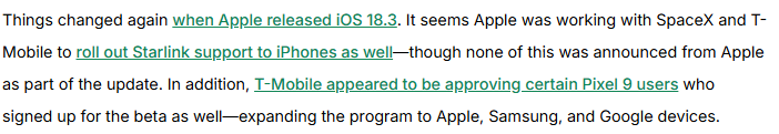 ಆದರೆ, ಒಂದು ಲೈಫ್ ಹ್ಯಾಕರ್ ವರದಿಯ ಪ್ರಕಾರ, ಈ ವೈಶಿಷ್ಟ್ಯವು “ಟಿ-ಮೊಬೈಲ್ ಗ್ರಾಹಕರಿಗೆ ಮಾತ್ರ ಸೀಮಿತವಾಗಿದೆ” ಮತ್ತು ಪ್ರಸ್ತುತ ಬೀಟಾದಲ್ಲಿದ್ದು ತುರ್ತು ಸಂದೇಶ ಕಳುಹಿಸುವಿಕೆ ಮತ್ತು ಸ್ಥಳ ಹಂಚಿಕೆಗೆ ಮಾತ್ರ ಕೇಂದ್ರೀಕೃತವಾಗಿದೆ. “ಐಫೋನ್ಗಳಿಗೂ ಸ್ಟಾರ್ಲಿಂಕ್ ಬೆಂಬಲವನ್ನು ಒದಗಿಸಲು ಆಪಲ್ ಸಂಸ್ಥೆಯು ಸ್ಪೇಸ್X ಮತ್ತು ಟಿ-ಮೊಬೈಲ್ ಜೊತೆ ಕೆಲಸ ಮಾಡುತ್ತಿತ್ತು ಎಂದು ತೋರುತ್ತದೆ – ಆದರೆ ನವೀಕರಣದ ಭಾಗವಾಗಿ ಇದ್ಯಾವುದನ್ನೂ ಆಪಲ್ ಘೋಷಿಸಿಲ್ಲ” ಎಂದು ವರದಿಯು ಸ್ಪಷ್ಟವಾಗಿ ಉಲ್ಲೇಖಿಸುತ್ತದೆ. ಆದ್ದರಿಂದ, ಈ ವೈಶಿಷ್ಟ್ಯವು “ನೇರ” ಅಲ್ಲ, ಅಂದರೆ ಐಫೋನ್ ಹಾರ್ಡ್ವೇರ್ ಟಿ-ಮೊಬೈಲ್ ಇಲ್ಲದೆ ಸ್ಟಾರ್ಲಿಂಕ್ ಉಪಗ್ರಹಗಳಿಗೆ ಸ್ಥಳೀಯವಾಗಿ ಲಿಂಕ್ ಮಾಡುತ್ತದೆ ಎಂದಾಗುತ್ತದೆ. ವರದಿಯ ಒಂದು ಭಾಗವನ್ನು ಕೆಳಗೆ ನೋಡಿ –