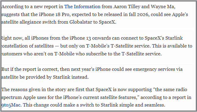 “ಆದರೆ ವರದಿ ಸರಿಯಾಗಿದ್ದರೆ, ಮುಂದಿನ ವರ್ಷದ ಐಫೋನ್ನಲ್ಲಿ ಬದಲಿಗೆ ಸ್ಟಾರ್ಲಿಂಕ್ ಉಪಗ್ರಹದ ಮೂಲಕ ತುರ್ತು ಸೇವೆಗಳನ್ನು ಒದಗಿಸಬಹುದು” ಎಂದು ಫೋರ್ಬ್ಸ್ ಕೂಡ ಹೇಳುತ್ತದೆ. ವರದಿಯ ಈ ಭಾಗವನ್ನು ಕೆಳಗೆ ನೋಡಿ-