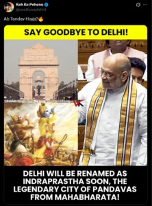 ಹೇಳಿಕೆ/Claim : ದೆಹಲಿಯನ್ನು ಶೀಘ್ರದಲ್ಲೇ ಮಹಾಭಾರತದ ಪಾಂಡವರ ನಗರವಾದ ಇಂದ್ರಪ್ರಸ್ಥ ಎಂದು ಮರುನಾಮಕರಣ ಮಾಡಲಾಗುವುದು.
