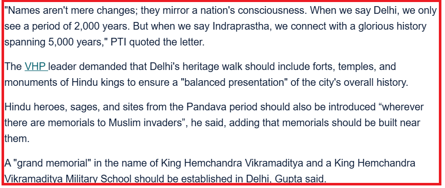 ಈ ವಿಷಯದ ಬಗ್ಗೆ ಇನ್ನಷ್ಟು ತಿಳಿದುಕೊಳ್ಳಲು ನಾವು ಮೊದಲು “ದೆಹಲಿಯನ್ನು ಇಂದ್ರಪ್ರಸ್ಥ ಎಂದು ಮರುನಾಮಕರಣ ಮಾಡಲಾಗುವುದು” ಎಂಬ ಪದಗಳೊಂದಿಗೆ ಅಂತರ್ಜಾಲದ ಹುಡುಕಾಟವನ್ನು ನಡೆಸಿದೆವು. ಹಿಂದೂಸ್ತಾನ್ ಟೈಮ್ಸ್ ನ ಅಕ್ಟೋಬರ್ 19, 2025ರ ವರದಿಯ ಪ್ರಕಾರ, ವಿಶ್ವ ಹಿಂದೂ ಪರಿಷತ್ (VHP) ದೆಹಲಿ ಸಚಿವರಾದ ಕಪಿಲ್ ಮಿಶ್ರಾ ಅವರಿಗೆ ಬರೆದ ಪತ್ರದಲ್ಲಿ ಮರುನಾಮಕರಣವನ್ನು ಪ್ರಸ್ತಾಪಿಸಿತು. ವರದಿಯು ಹೀಗಿದೆ: “ನಗರದ ಹೆಸರುಗಳು ರಾಷ್ಟ್ರದ ಪ್ರಜ್ಞೆಯನ್ನು ಪ್ರತಿಬಿಂಬಿಸುತ್ತವೆ, ಅದರ ಪ್ರಾಚೀನ ಇತಿಹಾಸ ಮತ್ತು ಸಂಸ್ಕೃತಿಯೊಂದಿಗೆ ಸಂಬಂಧ ಕಲ್ಪಿಸಬಹುದು. “ನಾವು ದೆಹಲಿ ಎಂದಾಗ, ಕೇವಲ 2,000 ವರ್ಷಗಳ ಅವಧಿಯನ್ನು ಮಾತ್ರ ನೋಡುತ್ತೇವೆ. ಆದರೆ ಇಂದ್ರಪ್ರಸ್ಥ ಎಂದಾಗ, 5,000 ವರ್ಷಗಳ ಅದ್ಭುತ ಇತಿಹಾಸದೊಂದಿಗೆ ಸಂಬಂಧ ಕಲ್ಪಿಸಬಹುದು.” ವರದಿಯ ಒಂದು ಭಾಗವನ್ನು ಕೆಳಗೆ ನೋಡಿ-