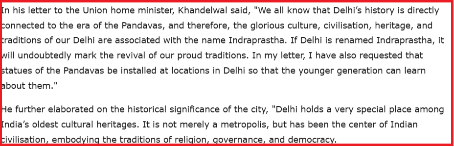 ಇದರ ನಂತರ, ನವೆಂಬರ್ 1, 2025 ರಂದು ಪ್ರಕಟವಾದ ಟೈಮ್ಸ್ ಆಫ್ ಇಂಡಿಯಾದ ಮತ್ತೊಂದು ವರದಿಯೂ ನಮಗೆ ದೊರಕಿತು. ವರದಿಯ ಪ್ರಕಾರ, ಸಂಸದ ಪ್ರವೀಣ್ ಖಂಡೇಲ್ವಾಲ್ ರವರು ಕೇಂದ್ರ ಗೃಹ ಸಚಿವ ಅಮಿತ್ ಶಾರವರಿಗೆ ಪತ್ರ ಬರೆದು ಪ್ರಾಚೀನ ಪರಂಪರೆಯನ್ನು ಗೌರವಿಸಲು ಮರುನಾಮಕರಣ ಮಾಡುವಂತೆ ಒತ್ತಾಯಿಸಿದರು. ಹಳೆಯ ದೆಹಲಿ ರೈಲು ನಿಲ್ದಾಣವನ್ನು ‘ಇಂದ್ರಪ್ರಸ್ಥ ಜಂಕ್ಷನ್’ ಮತ್ತು ಇಂದಿರಾ ಗಾಂಧಿ ಅಂತಾರಾಷ್ಟ್ರೀಯ ವಿಮಾನ ನಿಲ್ದಾಣವನ್ನು ‘ಇಂದ್ರಪ್ರಸ್ಥ ಅಂತರಾಷ್ಟ್ರೀಯ ವಿಮಾನ ನಿಲ್ದಾಣ’ ಎಂದು ಮರುನಾಮಕರಣ ಮಾಡಲು ಅವರು ಸಲಹೆ ನೀಡಿದರು. ವರದಿಯ ಒಂದು ಭಾಗವನ್ನು ಕೆಳಗೆ ನೋಡಿ-
