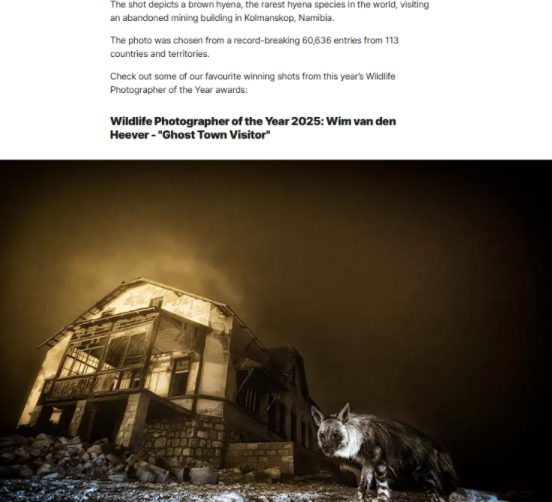 ಹೇಳಿಕೆಯಲ್ಲಿ ತೋರಿಸಿರುವಂತೆ ಹದ್ದಿನ ಚಿತ್ರ ಕಾಣಿಸದಿದ್ದಾಗ, ನಾವು ವರ್ಷದ ಅಧಿಕೃತ ವನ್ಯಜೀವಿ ಛಾಯಾಗ್ರಾಹಕ ಪ್ರಶಸ್ತಿಯನ್ನು ಹುಡುಕಿದೆವು. ಯುರೋನ್ಯೂಸ್ನ ಲೇಖನದಿಂದ ನಮಗೆ ತಿಳಿದುಬಂದದ್ದೇನೆಂದರೆ, ‘ದಕ್ಷಿಣ ಆಫ್ರಿಕಾದ ಛಾಯಾಗ್ರಾಹಕ ವಿಮ್ ವ್ಯಾನ್ ಡೆನ್ ಹೀವರ್ ರವರು ತಮ್ಮ “ಘೋಸ್ಟ್ ಟೌನ್ ವಿಸಿಟರ್” ಎಂಬ ಛಾಯಾಚಿತ್ರಕ್ಕಾಗಿ ವರ್ಷ 2025ರ ವನ್ಯಜೀವಿ ಛಾಯಾಗ್ರಾಹಕ ಪ್ರಶಸ್ತಿ ಮತ್ತು ಅರ್ಬನ್ ವೈಲ್ಡ್ಲೈಫ್ ಪ್ರಶಸ್ತಿಯನ್ನು ಗೆದ್ದಿದ್ದರು.’ ಈ ಲೇಖನವು ಅತ್ಯುತ್ತಮವಾದ ಕೆಲವು ಛಾಯಾಚಿತ್ರಗಳು ಮತ್ತು ಅವುಗಳನ್ನು ವಿವರಿಸುವ ವಿವರಣೆಯನ್ನು ಒದಗಿಸುತ್ತದೆ. ಲೇಖನದಲ್ಲಿನ ಒಂದು ಫೋಟೋ ಮತ್ತು ಅದರ ಒಂದು ಭಾಗವನ್ನು ಕೆಳಗೆ ನೋಡಿ-