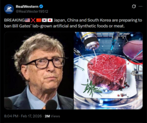 ದಕ್ಷಿಣ ಏಷ್ಯಾದ ಕೆಲವು ದೇಶಗಳು ಬಿಲ್ ಗೇಟ್ಸ್ ಅವರ ಪ್ರಯೋಗಾಲಯದಲ್ಲಿ ಬೆಳೆದ ಆಹಾರವನ್ನು ನಿಷೇಧಿಸಲಿವೆ ಎಂದು ಹಲವಾರು ಸಾಮಾಜಿಕ ಮಾಧ್ಯಮ ಬಳಕೆದಾರರು ಹೇಳಿಕೊಂಡಿದ್ದಾರೆ. ದೃಢೀಕೃತ X ಬಳಕೆದಾರ ‘RealWester19512’ ಅಂತಹ ಒಂದು ಹೇಳಿಕೆಯನ್ನು “ಬ್ರೇಕಿಂಗ್ ಜಪಾನ್, ಚೀನಾ ಮತ್ತು ದಕ್ಷಿಣ ಕೊರಿಯಾ ಬಿಲ್ ಗೇಟ್ಸ್ ಅವರ ಪ್ರಯೋಗಾಲಯದಲ್ಲಿ ಬೆಳೆದ ಕೃತಕ ಮತ್ತು ಸಂಶ್ಲೇಷಿತ ಆಹಾರಗಳು ಅಥವಾ ಮಾಂಸವನ್ನು ನಿಷೇಧಿಸಲು ತಯಾರಿ ನಡೆಸುತ್ತಿವೆ” ಎಂಬ ಶೀರ್ಷಿಕೆಯೊಂದಿಗೆ ಹಂಚಿಕೊಂಡಿದ್ದಾರೆ. ಈ ಪೋಸ್ಟ್ ಗೆ 2 ಮಿಲಿಕ್ಕಿಂತಲೂ ಹೆಚ್ಚು ವೀಕ್ಷಣೆಗಳು ದೊರಕಿವೆ, ಅದನ್ನು ಕೆಳಗೆ ನೋಡಬಹುದು –