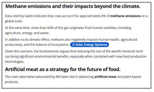 ಈ ವಿಷಯದ ಬಗ್ಗೆ ತಿಳಿಯಲು ನಾವು ಮೊದಲು “ಬಿಲ್ ಗೇಟ್ಸ್ ಸಿಂಥಟಿಕ್ ಮಾಂಸ” ಎಂಬ ಪದಗಳೊಂದಿಗೆ ಅಂತರ್ಜಾಲ ಹುಡುಕಾಟವನ್ನು ನಡೆಸಿದೆವು. ಒಂದು ಲೇಖನದ ಪ್ರಕಾರ, ಮೀಥೇನ್ ಹೊರಸೂಸುವಿಕೆಯನ್ನು ಕಡಿಮೆ ಮಾಡಲು ಗೇಟ್ಸ್ ಸಾಂಪ್ರದಾಯಿಕ ಜಾನುವಾರು ಸಾಕಣೆಯಿಂದ ಕೃತಕ ಅಥವಾ ಸಸ್ಯ ಆಧಾರಿತ ಮಾಂಸದ ನಿಟ್ಟಿನಲ್ಲಿ ಭಾಗಶಃ ಬದಲಾವಣೆಯನ್ನು ಪ್ರತಿಪಾದಿಸುತ್ತಿದ್ದಾರೆ. “ಈಗ ಜಾಗತಿಕ ಮಟ್ಟದಲ್ಲಿ ಆಹಾರ ಉತ್ಪಾದನಾ ಮಾದರಿಯಲ್ಲಿ ಬದಲಾವಣೆಯ ಅಗತ್ಯವಾಗಿದೆ” ಎಂದು ಆತ ನಂಬುತ್ತಾರೆ ಮತ್ತು ಮುಖ್ಯ ಪರ್ಯಾಯವಾಗಿ “ಕೃತಕ ಮಾಂಸ ಮತ್ತು ಸಸ್ಯ ಆಧಾರಿತ ಉತ್ಪನ್ನಗಳನ್ನು ಮುಂದುವರಿಸುವುದನ್ನು” ಉತ್ತೇಜಿಸುತ್ತಾರೆ ಎಂದು ಲೇಖನವು ಉಲ್ಲೇಖಿಸುತ್ತದೆ. ವರದಿಯ ಒಂದು ಭಾಗವನ್ನು ಕೆಳಗೆ ವೀಕ್ಷಿಸಿ-