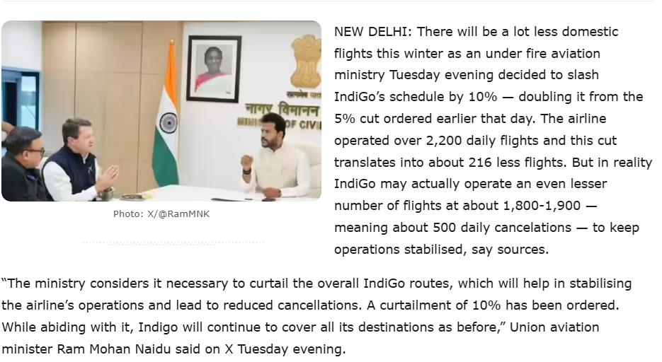 ಟೈಮ್ಸ್ ಆಫ್ ಇಂಡಿಯಾದ ವರದಿಯೊಂದು ಇದನ್ನು ಒಳಗೊಂಡಿದ್ದು, “ಈ ಚಳಿಗಾಲ ಡೊಮೆಸ್ಟಿಕ್ ವಿಮಾನಗಳು ತುಂಬಾ ಕಡಿಮೆಯಾಗಲಿವೆ ಏಕೆಂದರೆ ಮಂಗಳವಾರ ಸಂಜೆ ತೀವ್ರ ತಾಪಕ್ಕೊಳಗಾಗಿರುವ ವಾಯುಯಾನ ಸಚಿವಾಲಯವು ಇಂಡಿಗೋದ ವೇಳಾಪಟ್ಟಿಯನ್ನು 10% ರಷ್ಟು ಕಡಿತಗೊಳಿಸಲು ನಿರ್ಧರಿಸಿದೆ, ಇದು ಆ ದಿನದ ಆರಂಭದಲ್ಲಿ ಆದೇಶಿಸಲಾದ 5% ಕಡಿತಕ್ಕಿಂದ ದ್ವಿಗುಣವಾಗಿದೆ” ಎಂದು ಹೇಳಿದೆ. ವರದಿಯ ಒಂದು ಭಾಗವನ್ನು ಕೆಳಗೆ ನೋಡಿ: