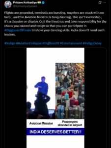 Flights delayed, terminals overcrowded, passengers helpless… and the Aviation Minister is dancing. This government has mastered one thing: entertainment over governance. Stop dancing and start managing the mess you created#BiggBoss19 pic.twitter.com/T7hYWY0ooI