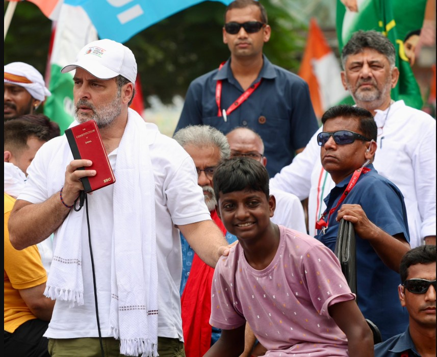 ಡಿಕೆ ಶಿವಕುಮಾರ್ ರವರ ಪೋಸ್ಟ್ನಲ್ಲಿ ಲಗತ್ತಿಸಲಾದ ಫೋಟೋಗಳಲ್ಲಿ ರಾಹುಲ್ ಗಾಂಧಿಯವರು ಜೀಪಿನಲ್ಲಿ ಸಂವಿಧಾನದ ಪ್ರತಿಯನ್ನು ಹಿಡಿದಿರುವುದನ್ನು ಸ್ಪಷ್ಟವಾಗಿ ಕಾಣಬಹುದು, ಅವರ ಸುತ್ತಲೂ ಶಿವಕುಮಾರ್ ಸೇರಿದಂತೆ ಇತರ ನಾಯಕರೂ ಇದ್ದಾರೆ. ಅಂತಹ ಒಂದು ಚಿತ್ರವನ್ನು ಕೆಳಗೆ ನೋಡಿ: