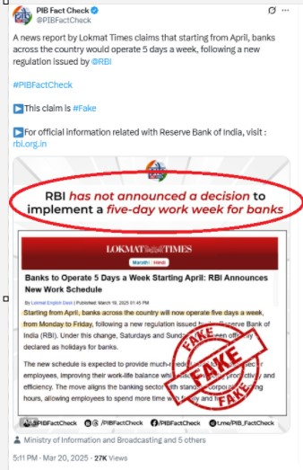 ಸೆಪ್ಟೆಂಬರ್ 14, 2025 ರಂದು ಪ್ರಕಟವಾದ ‘ಜೀ಼24ಘಂಟಾ’ ದ X ಪೋಸ್ಟ್‌ನಲ್ಲಿ ಬ್ಯಾಂಕುಗಳು ಇನ್ನುಮುಂದೆ ಕಟ್ಟುನಿಟ್ಟಾಗಿ ವಾರಕ್ಕೆ ಐದು ದಿನಗಳು ಮಾತ್ರ ಕಾರ್ಯನಿರ್ವಹಿಸುತ್ತವೆ ಎಂದು ಹೇಳಲಾಗಿದೆ. ಪೋಸ್ಟ್ ಬಂಗಾಳಿ ಭಾಷೆಯ ಈ  ಶೀರ್ಷಿಕೆಯನ್ನು ಹೊಂದಿತ್ತು: অবিশ্বাস্য! এবার থেকে ব্যাংক খোলা থাকবে সপ্তাহে ৫ দিন, দু’দিন ছুটি? জেনে নিন, উইক অফ নিয়ে আরবিআই রুল কী বলছে?