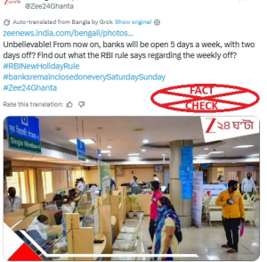 ಸೆಪ್ಟೆಂಬರ್ 14, 2025 ರಂದು ಪ್ರಕಟವಾದ ‘ಜೀ಼24ಘಂಟಾ’ ದ X ಪೋಸ್ಟ್‌ನಲ್ಲಿ ಬ್ಯಾಂಕುಗಳು ಇನ್ನುಮುಂದೆ ಕಟ್ಟುನಿಟ್ಟಾಗಿ ವಾರಕ್ಕೆ ಐದು ದಿನಗಳು ಮಾತ್ರ ಕಾರ್ಯನಿರ್ವಹಿಸುತ್ತವೆ ಎಂದು ಹೇಳಲಾಗಿದೆ. ಪೋಸ್ಟ್ ಬಂಗಾಳಿ ಭಾಷೆಯ ಈ  ಶೀರ್ಷಿಕೆಯನ್ನು ಹೊಂದಿತ್ತು: অবিশ্বাস্য! এবার থেকে ব্যাংক খোলা থাকবে সপ্তাহে ৫ দিন, দু’দিন ছুটি? জেনে নিন, উইক অফ নিয়ে আরবিআই রুল কী বলছে?